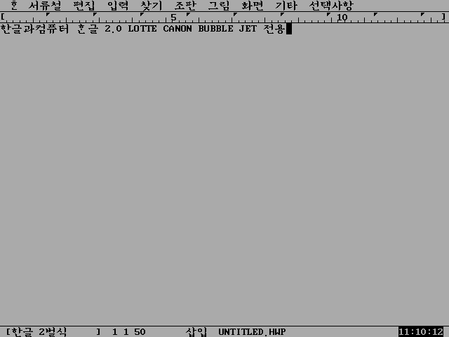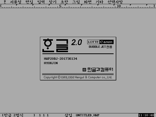 한글 정보창입니다. 한글 2.0 롯데캐논 버블젯 전용이라고 나와있습니다.