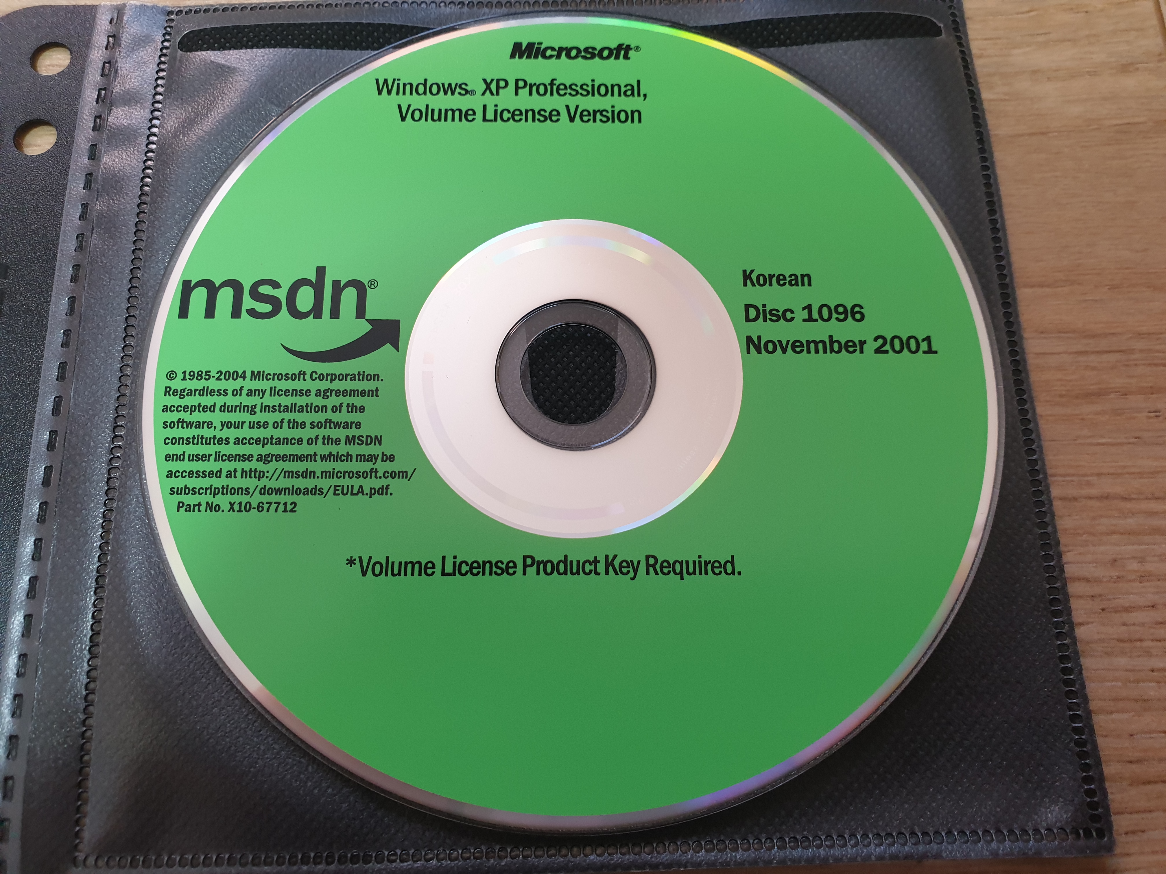 디스크의 모습입니다. 디스크 넘버는 1096이며, 파트 넘버는 X10-67712이고, CD 라벨명은 WXPVOL_KO입니다. 2001년 11월에 나왔으며, 내용물은 윈도우 XP 프로페셔널 볼륨 라이센스 버전 한글판입니다. 좌측에는 MSDN 로고와 함께 '소프트웨어를 설치하는 동안 승인된 라이센스 계약과 관계없이, 소프트웨어를 사용하는 것은 (EULA 링크)에서 액세스할 수 있는 MSDN 최종 사용자 라이센스 계약의 승인을 구성합니다.' 라는 문구가 적혀있습니다. 볼륨 라이센스 제품 키가 필요하다는 문구도 하단에 있습니다.