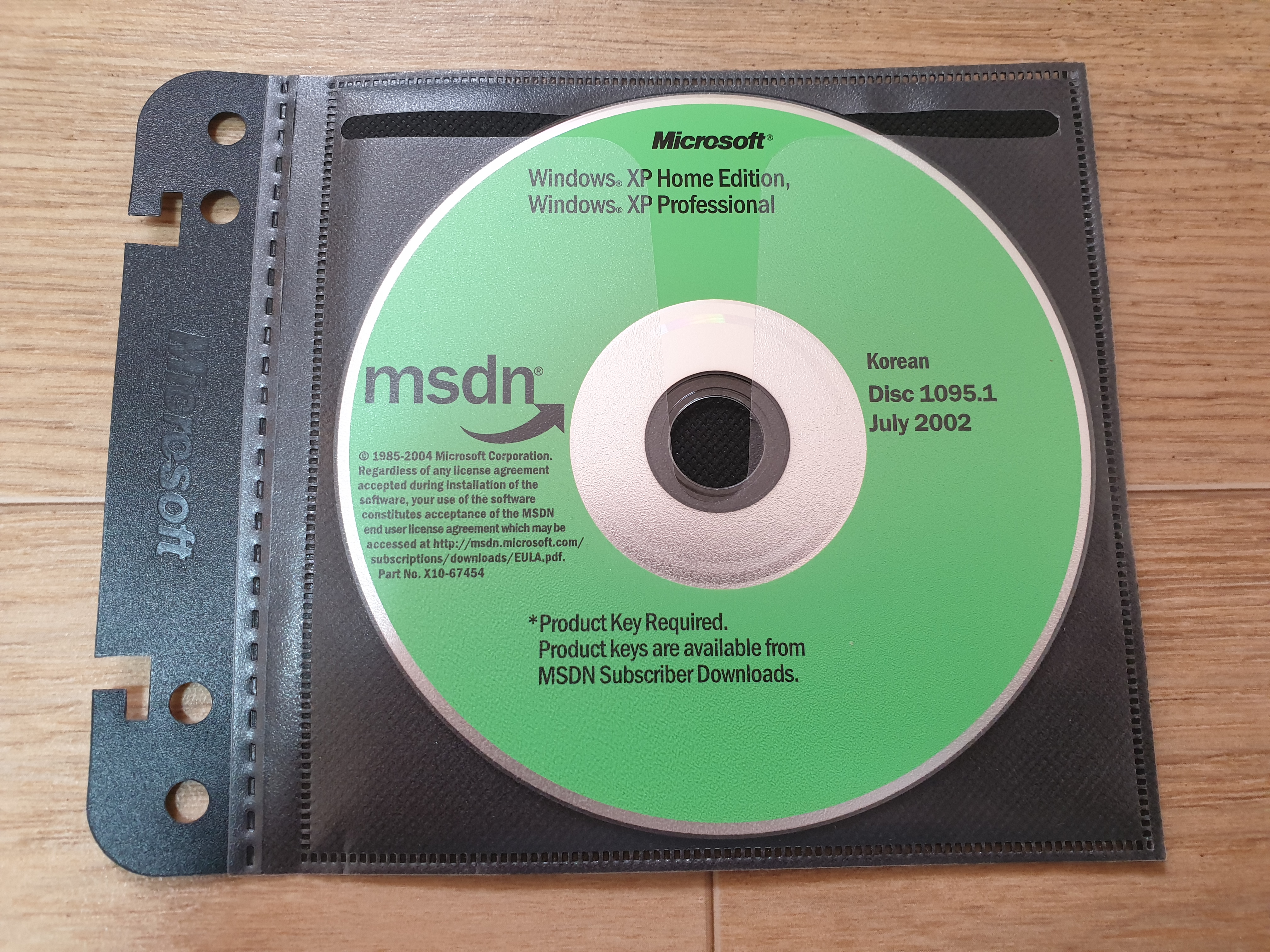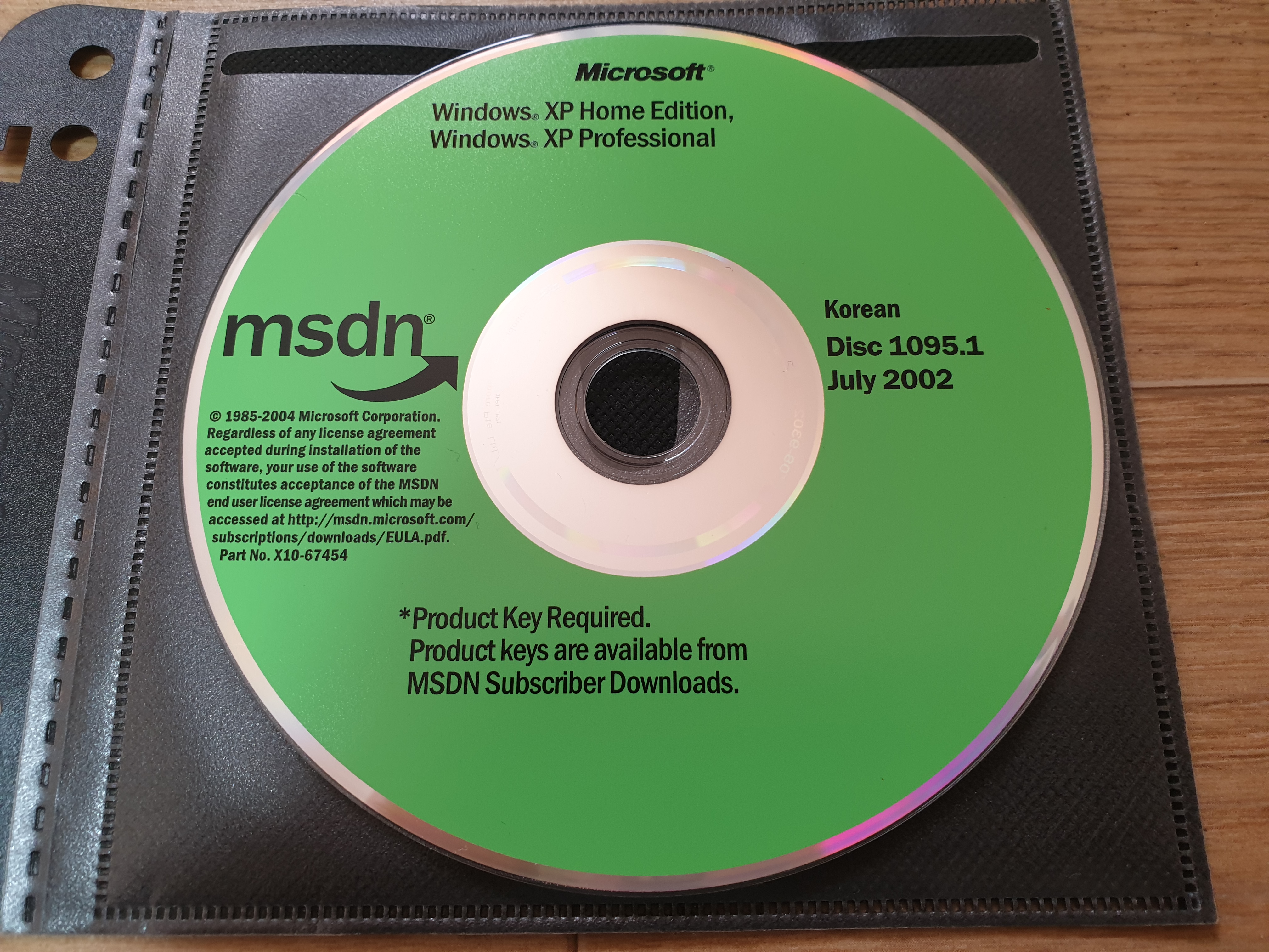 디스크의 모습입니다. 디스크 넘버는 1095.1이며, 파트 넘버는 X10-67454이고, CD 라벨명은 WXPFPP_KO입니다. 2002년 7월에 나왔으며, 내용물은 윈도우 XP 홈 에디션, 윈도우 XP 프로페셔널 한글판입니다. 좌측에는 MSDN 로고와 사용권 계약서 문구가 적혀있습니다. 하단에 적혀있는 문구는 제품 키 필요함. 제품 키는 MSDN 구독자 다운로드에서 이용 가능함이라고 적혀있습니다.