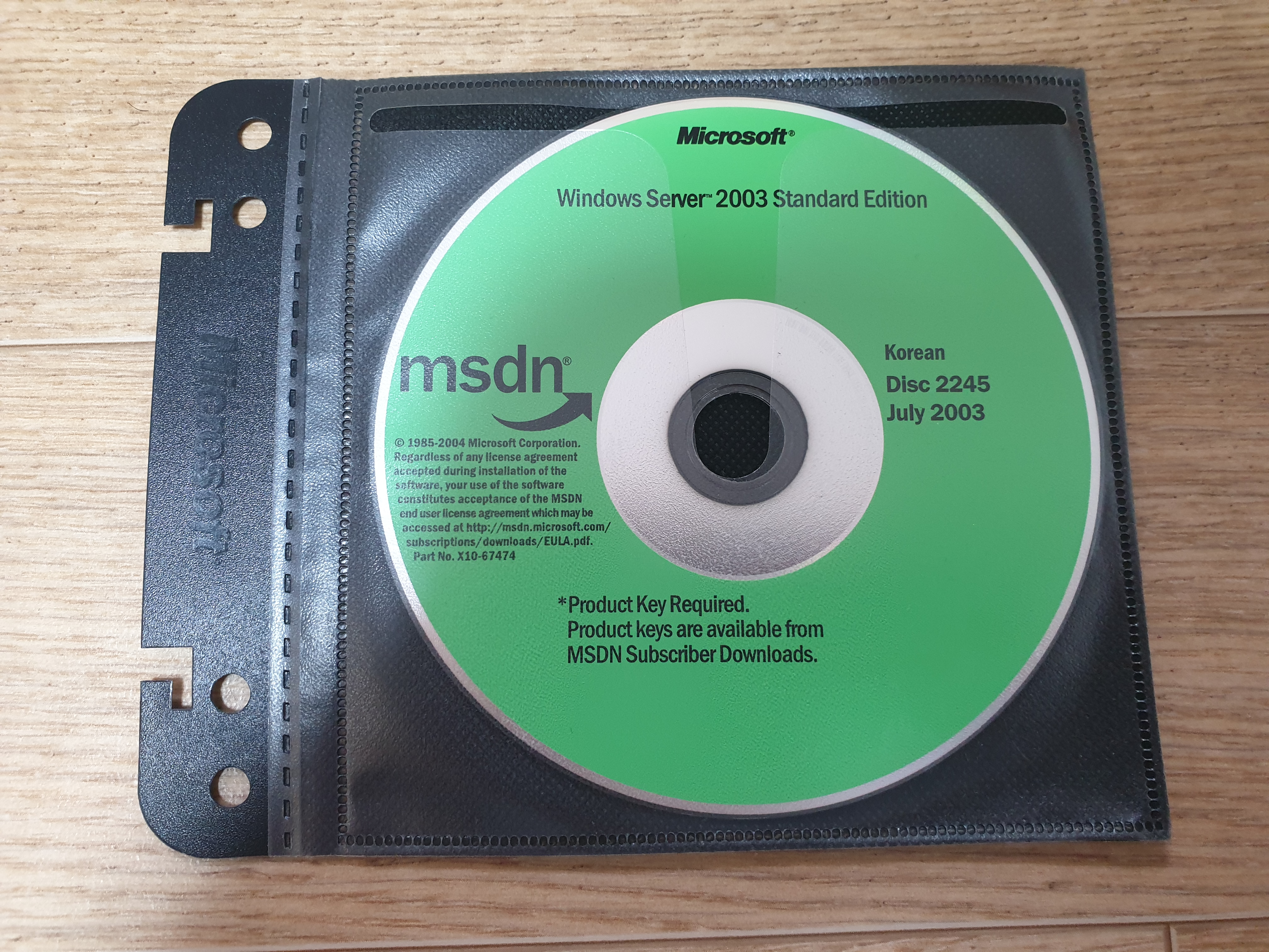 디스크의 모습입니다. 디스크 넘버는 2245이며, 파트 넘버는 X10-67474이고, CD 라벨명은 NRMSFPP_KO입니다. 2003년 7월에 나왔으며, 내용물은 윈도우 서버 2003 스탠다드 에디션 한글판입니다. 좌측에는 MSDN 로고와 사용권 계약서가 적혀있고, 하단에는 '제품 키가 필요함. 제품 키는 MSDN 구독자 다운로드에서 이용 가능함.' 이라고 적혀있습니다.