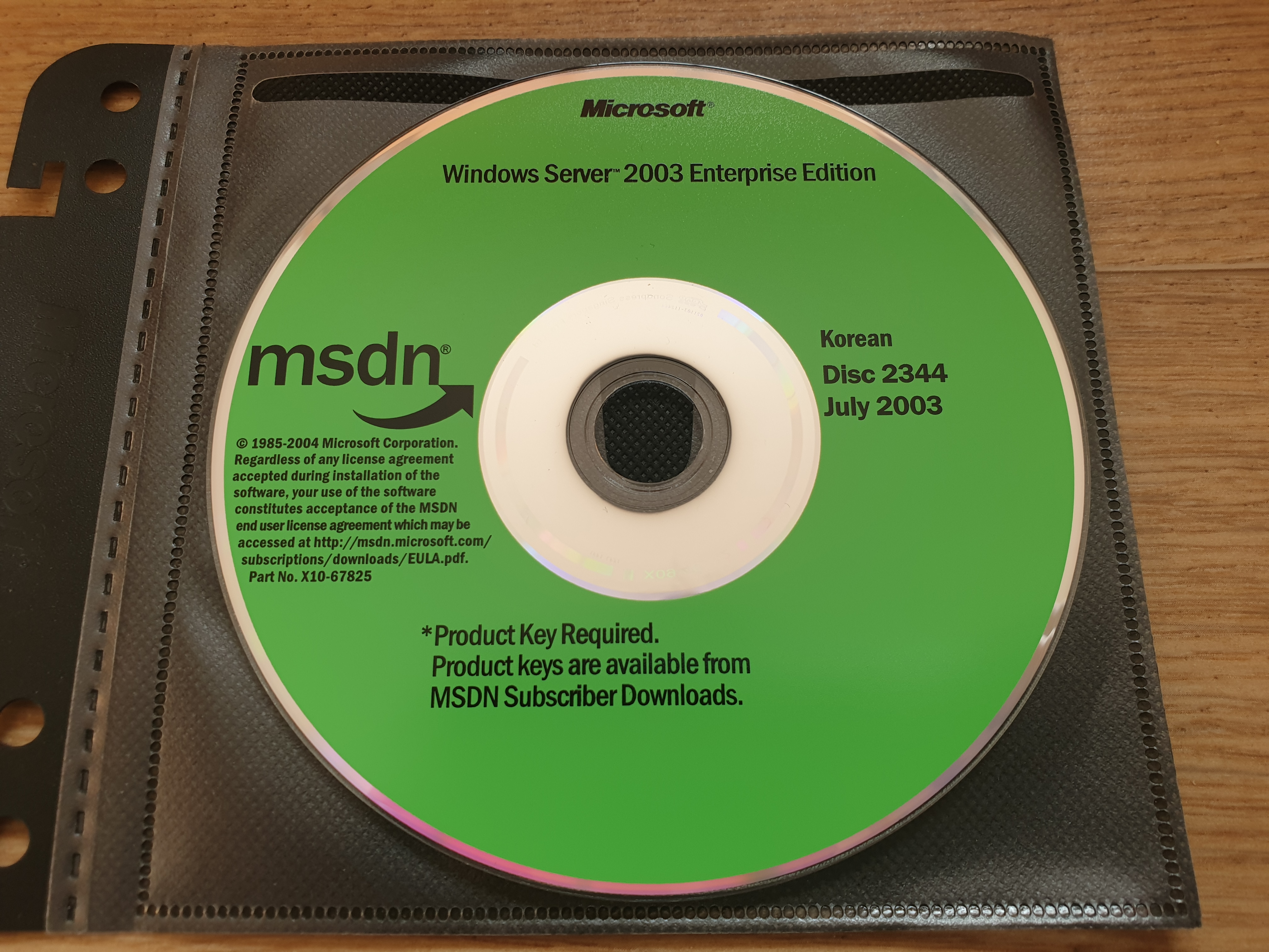 디스크의 모습입니다. 디스크 넘버는 2344이며, 파트 넘버는 X10-67825이고, CD 라벨명은 NRMEFPP_KO입니다. 2003년 7월에 나왔으며, 한글판입니다. 내용물은 윈도우 서버 2003 엔터프라이즈 에디션입니다. CD 좌측 표면에는 MSDN 로고와 사용권 계약서가 적혀있습니다. 하단에는 '제품 키가 필요함. 제품 키는 MSDN 구독자 다운로드에서 이용 가능함.' 이라는 문구가 적혀있습니다.
