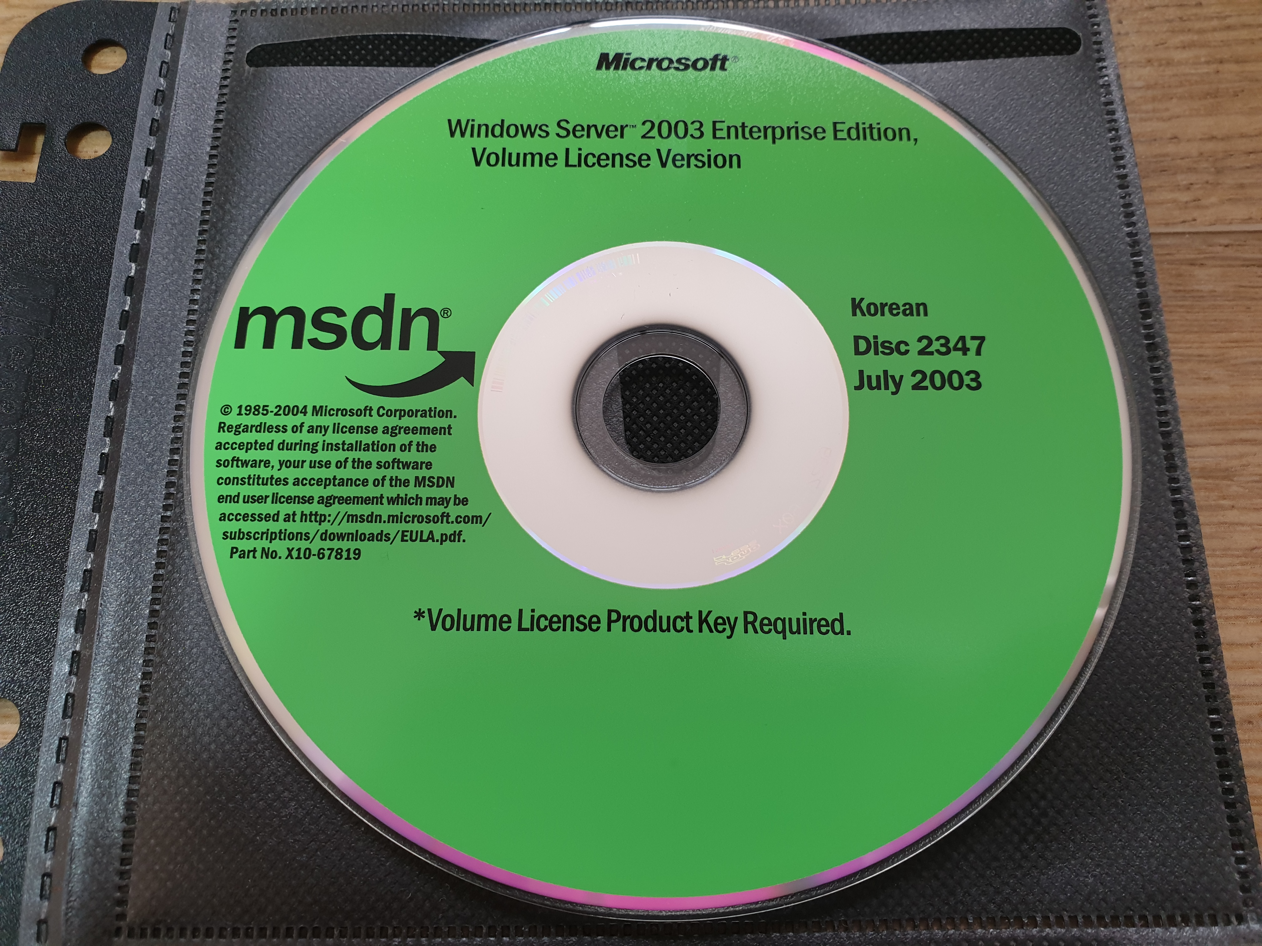 디스크의 모습입니다. 디스크 넘버는 2347이며, 파트 넘버는 X10-67819이고, CD 라벨명은 NRMEVOL_KO입니다. 2003년 7월에 나왔으며, 한글판입니다. 내용물은 윈도우 서버 2003 엔터프라이즈 에디션 볼륨 라이센스 버전입니다. 좌측에는 MSDN 로고와 사용권 계약서가 있습니다. 하단에는 '볼륨 라이센스 제품 키가 필요함.' 이라는 문구가 적혀있습니다.