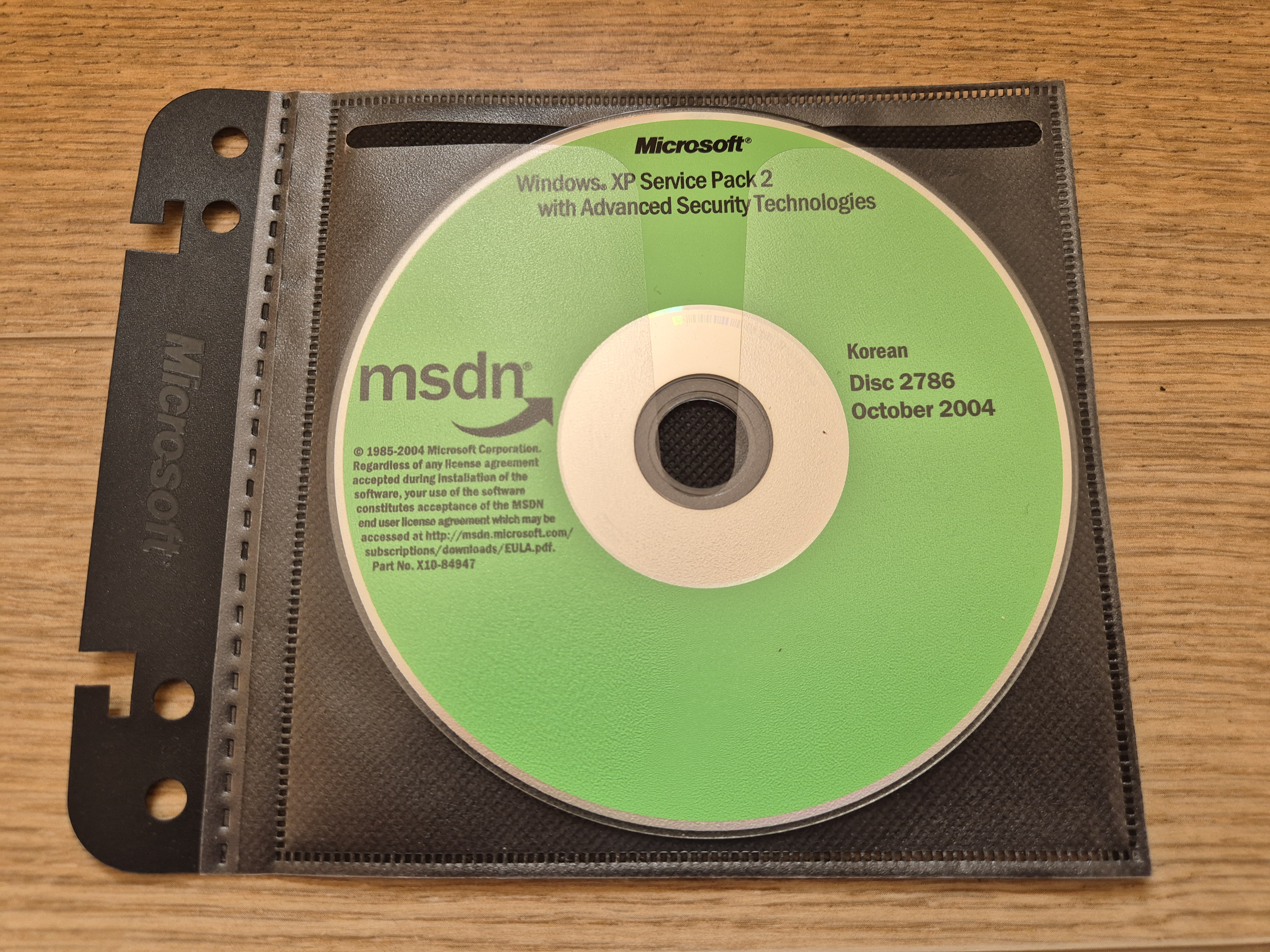 디스크의 모습입니다. 디스크 넘버는 2786이며, 파트 넘버는 X10-84947이고, CD 라벨명은 VRMSP_KO입니다. 2004년 10월에 나왔으며, 내용물은 향상된 보안 기술이 포함된 윈도우 XP 서비스 팩 2입니다. 한글판입니다. 디스크 좌측에는 MSDN 로고와 사용권 계약서가 적혀있습니다.