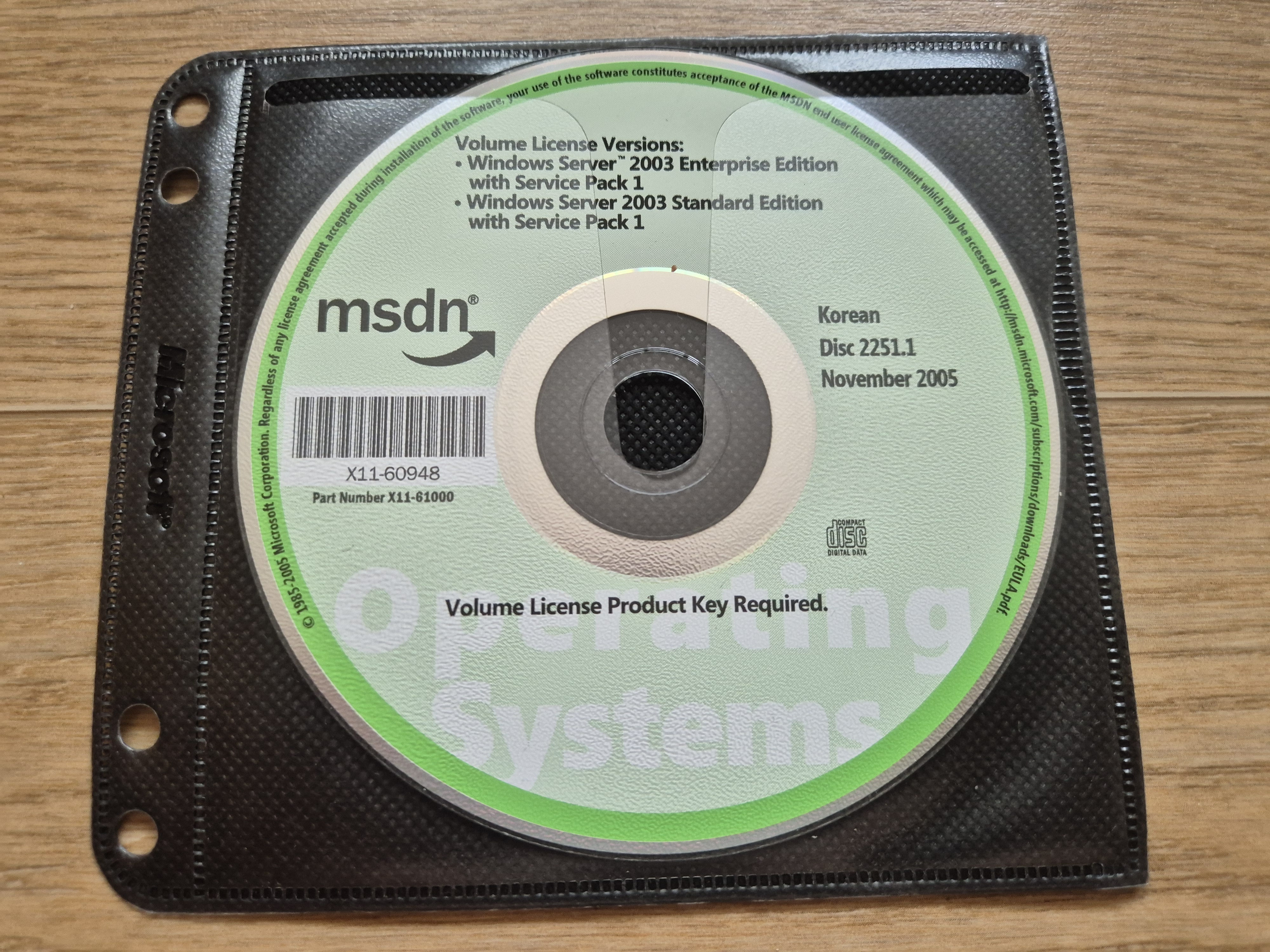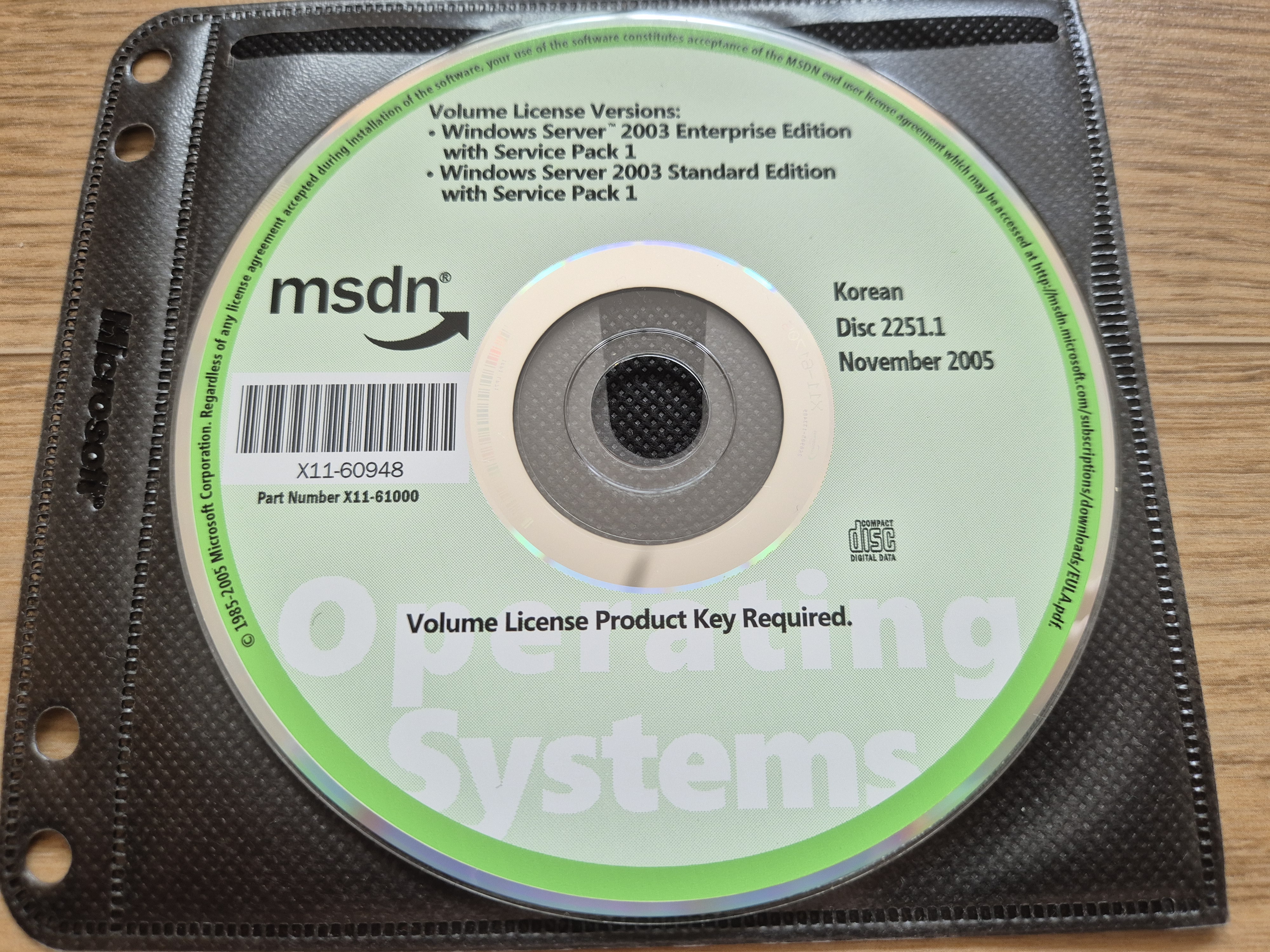 디스크의 모습입니다. 디스크 넘버는 2251.1이고, 파트 넘버는 X11-61000이며, CD 라벨명은 KO_WS03VL입니다. 2005년 11월에 나왔으며, 내용물은 서비스 팩 1을 포함한 윈도우 서버 2003 엔터프라이즈 에디션과 서비스 팩 1을 포함한 윈도우 서버 2003 스탠다드 에디션입니다. 둘 다 볼륨 에디션이며, CD 하단에는 볼륨 라이센스 제품 키가 필요하다는 문구가 적혀있습니다.