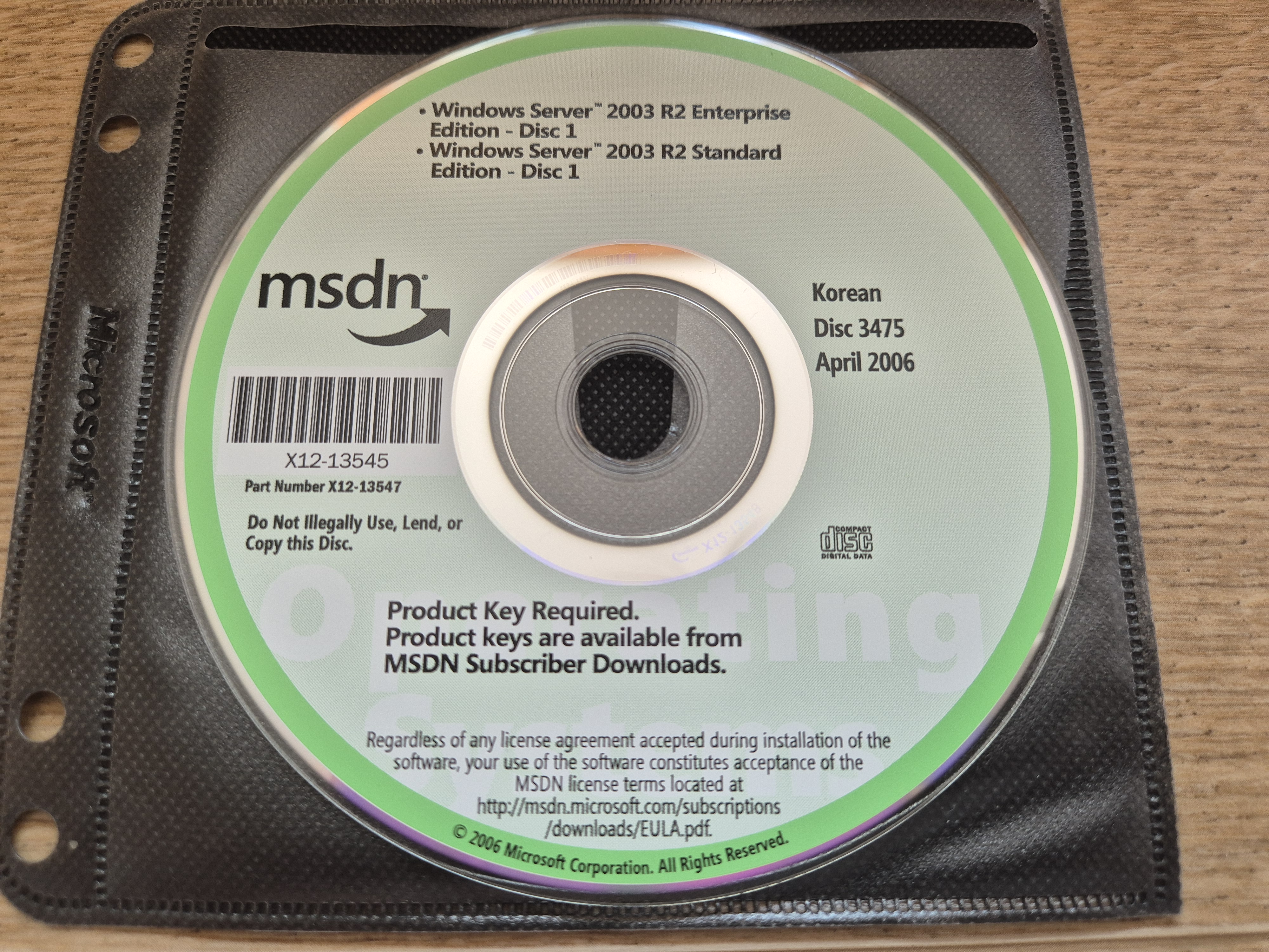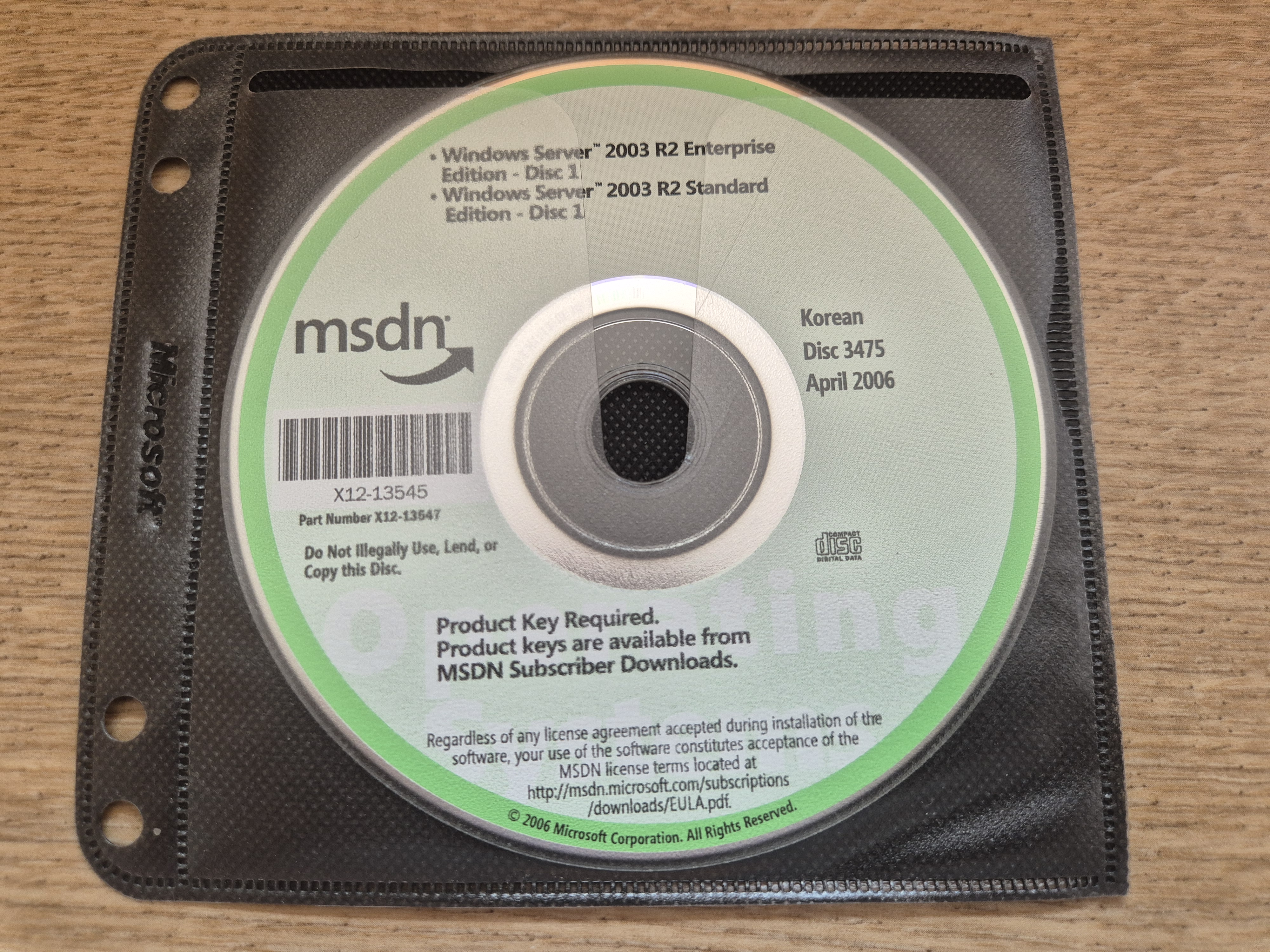 디스크의 모습입니다. 디스크 넘버는 3475이고, 파트 넘버는 X12-13547이며, CD 라벨명은 KO_WIN2003_R2입니다. 2006년 4월에 나왔으며, 내용물은 윈도우 서버 2003 R2 엔터프라이즈 에디션 디스크 1과 윈도우 서버 2003 R2 스탠다드 에디션 디스크 1입니다. CD에 많은 문구가 적혀있습니다. '이 디스크를 불법으로 사용, 양도 또는 복사하지 말 것.', '제품 키 필요함. 제품 키는 MSDN 구독자 다운로드에서 이용 가능함.', '소프트웨어 설치 과정에서 수락한 라이센스 계약과 관계없이 소프트웨어를 사용하는 것은 다음 링크에 있는 MSDN 라이센스 조건을 수락하는 것으로 간주됩니다.' 라고 적혀있습니다.