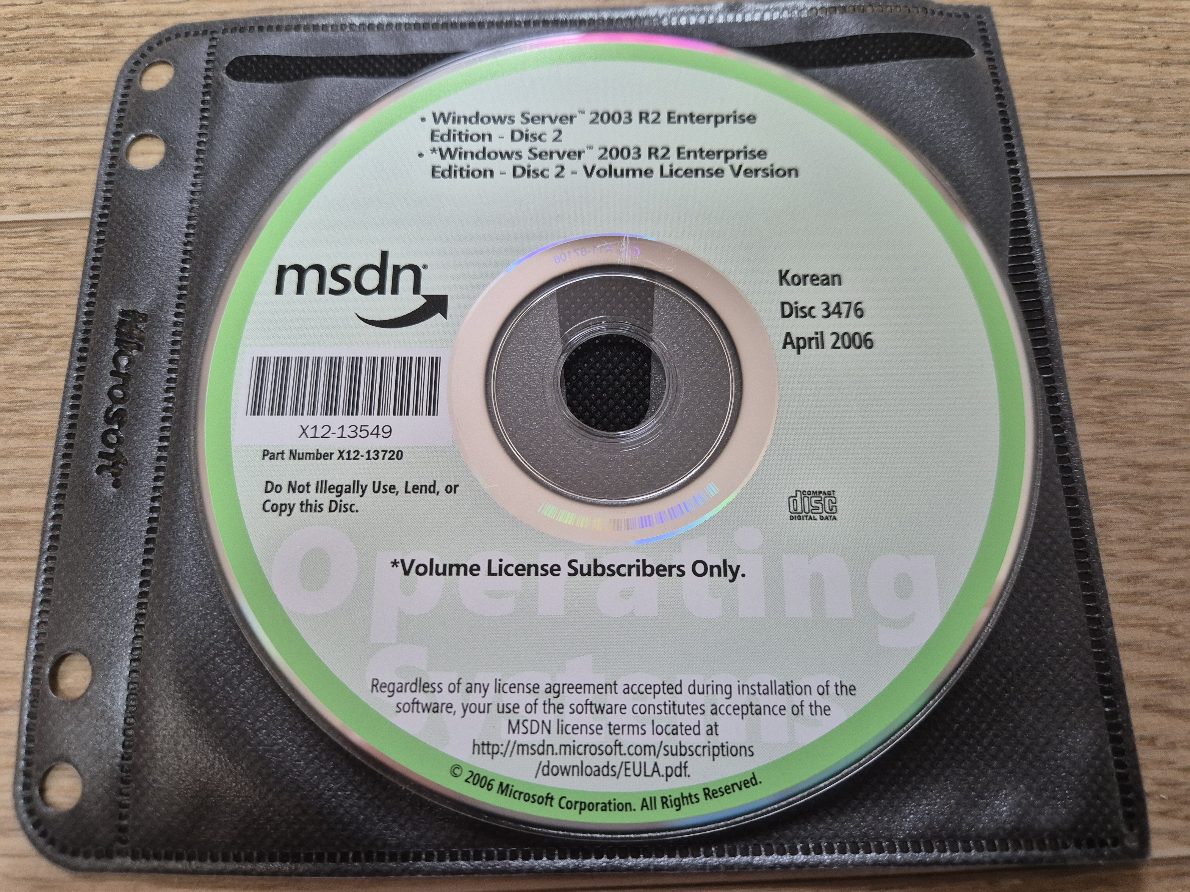 디스크의 모습입니다. 디스크 넘버는 3476이고, 파트 넘버는 X12-13720이며, CD 라벨명은 BRMECD2FRE_KO입니다. 2006년 4월에 나왔으며, 내용물은 윈도우 서버 2003 R2 엔터프라이즈 에디션 디스크 2와 윈도우 서버 2003 Re 엔터프라이즈 에디션 볼륨 라이센스 버전 디스크 2입니다. CD에는 '이 디스크를 불법으로 사용, 양도 또는 복사하지 말 것.', '볼륨 라이센스 구독자 전용.', '소프트웨어 설치 과정에서 수락한 라이센스 계약과 관계없이 소프트웨어를 사용하는 것은 다음 링크에 있는 MSDN 라이센스 조건을 수락하는 것으로 간주됩니다.' 라고 적혀있습니다.
