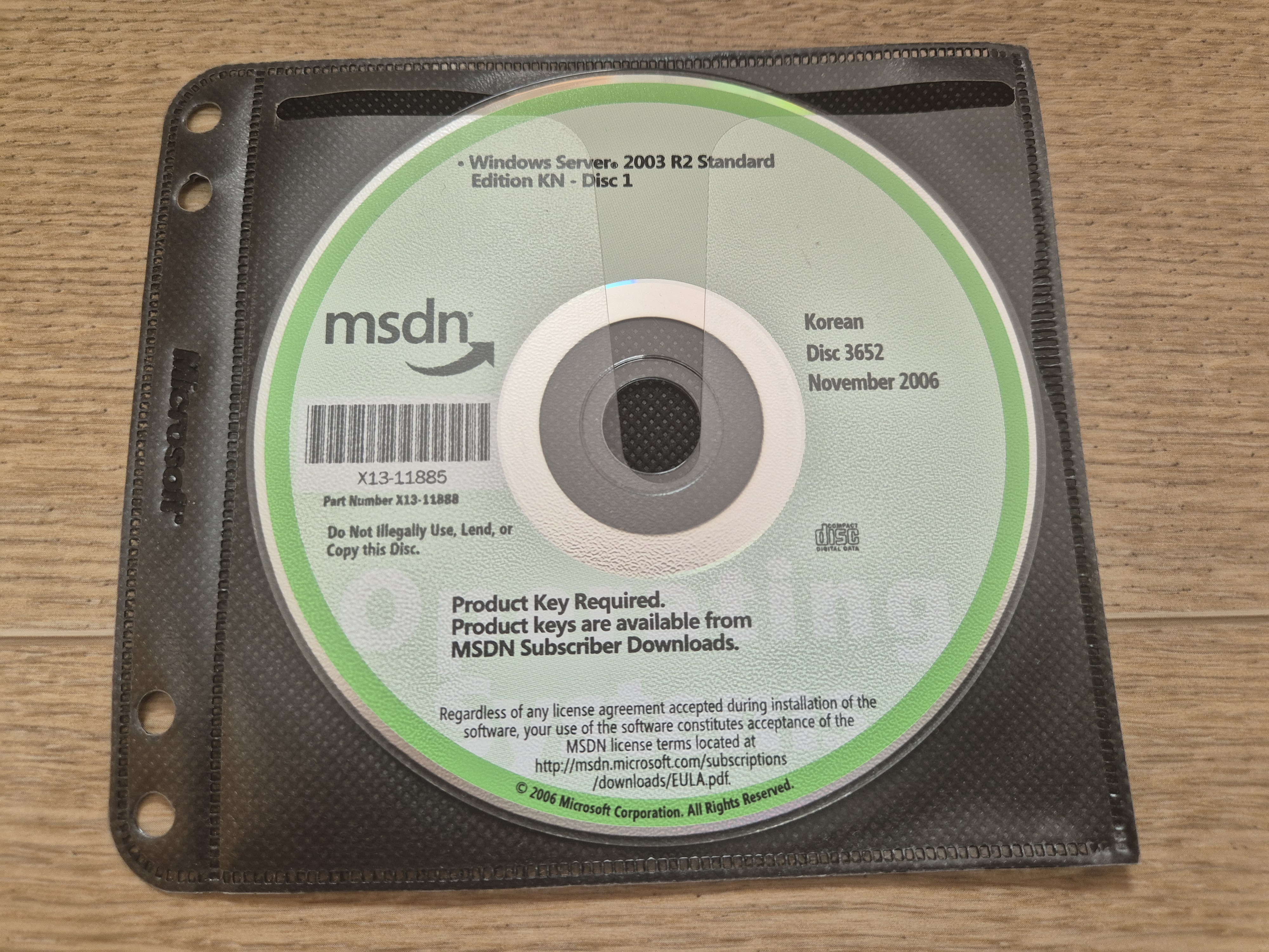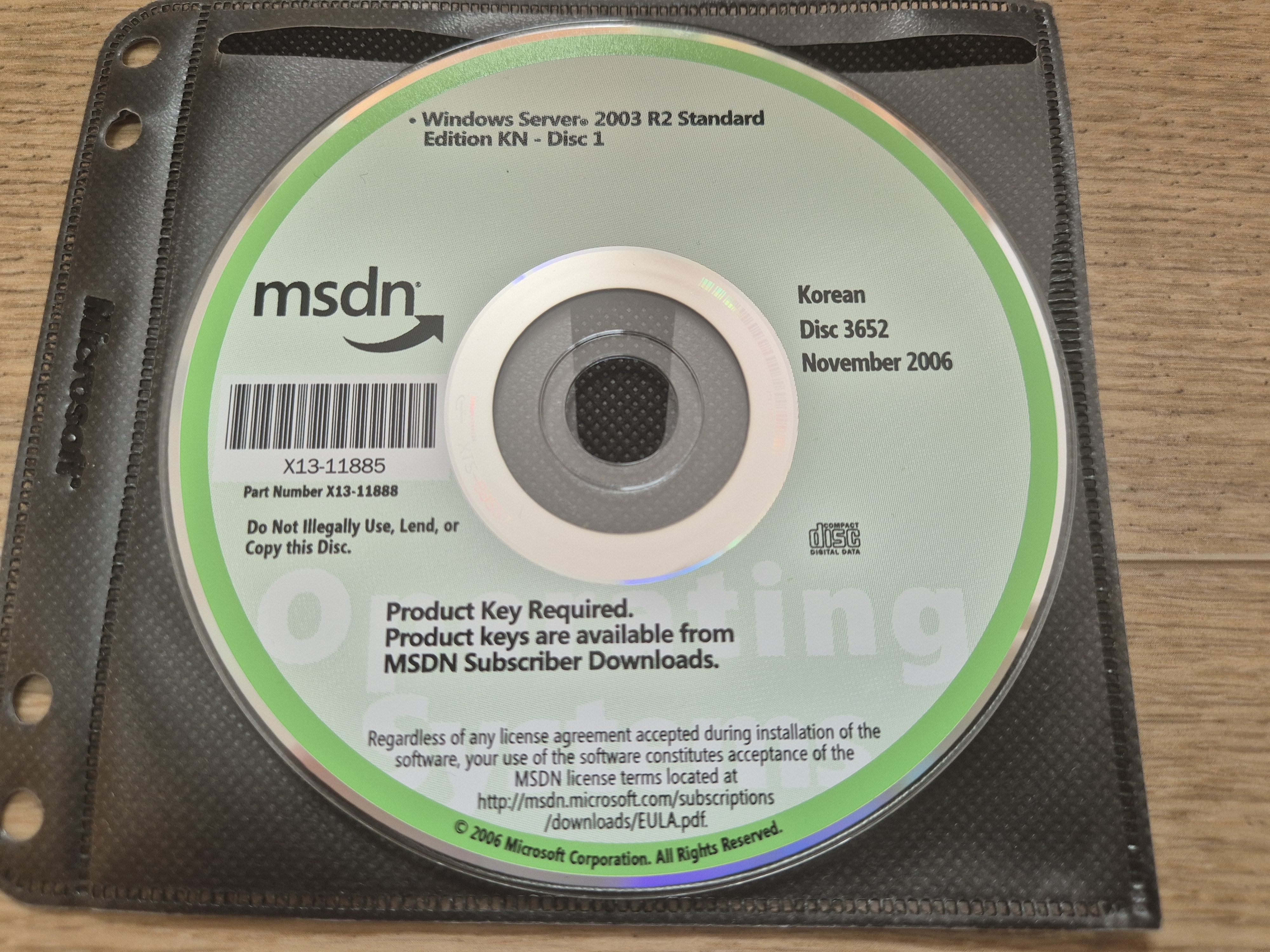 디스크의 모습입니다. 디스크 넘버는 3652이고, 파트 넘버는 X13-11888이며, CD 라벨명은 BX2SKNFPP_KO입니다. 2006년 11월에 나왔으며, 내용물은 윈도우 서버 2003 R2 스탠다드 에디션 KN 디스크 1입니다. CD 표면에는 '이 디스크를 불법으로 사용, 양도 또는 복사하지 말 것.', '제품 키 필요함. 제품 키는 MSDN 구독자 다운로드에서 이용 가능함.' 이라는 문구가 적혀있습니다.