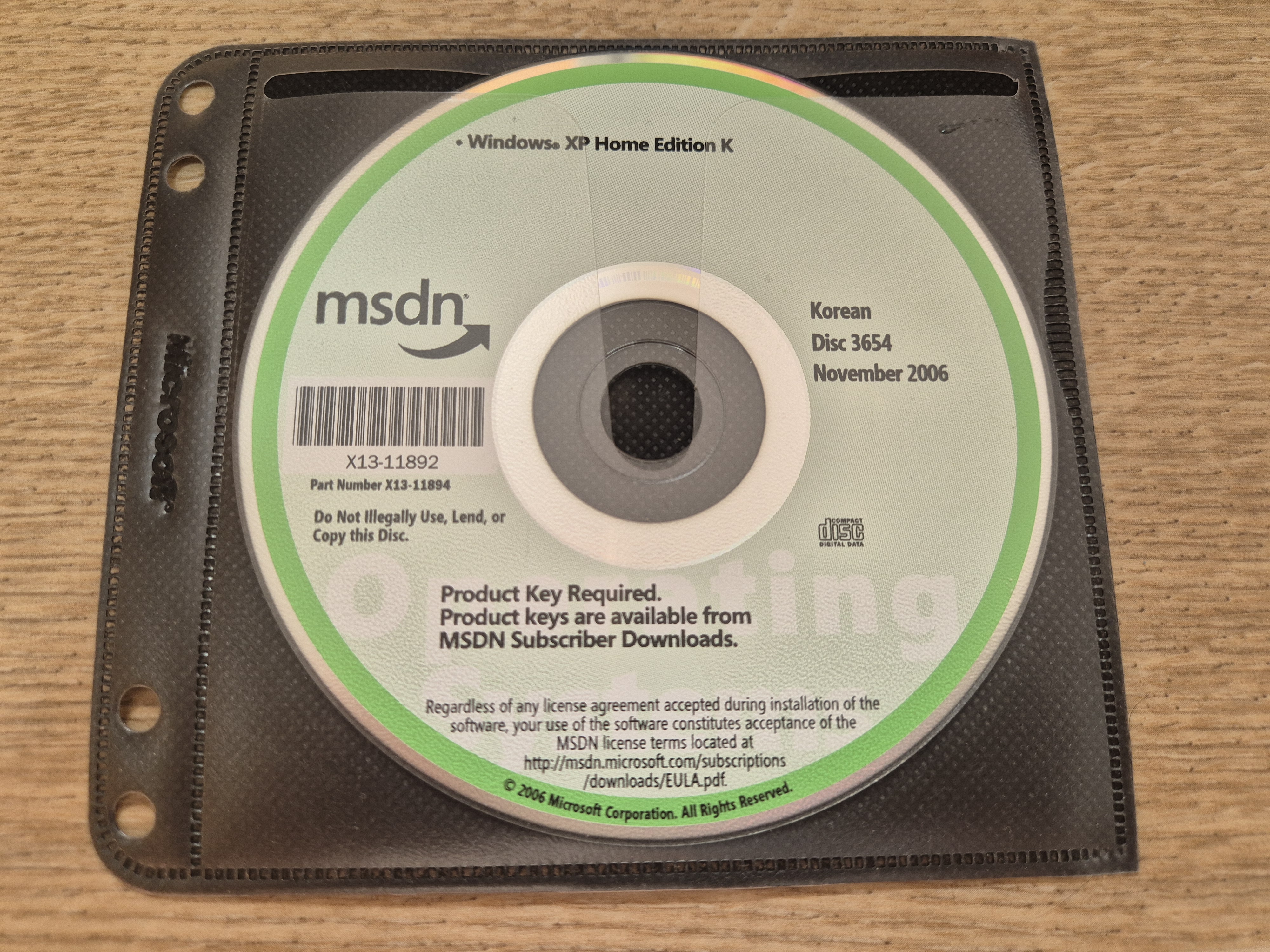 디스크의 모습입니다. 디스크 넘버는 3654이고, 파트 넘버는 X13-11894이며, CD 라벨명은 VX2HKFPP_KO입니다. 2006년 11월에 나왔으며, 내용물은 윈도우 XP 홈 에디션 K입니다. CD 표면에는 '이 디스크를 불법으로 사용, 양도 혹은 복사하지 말 것.' 이라는 문구와 '제품 키 필요함. 제품 키는 MSDN 구독자 다운로드에서 이용 가능함.' 이라는 문구가 적혀있습니다.