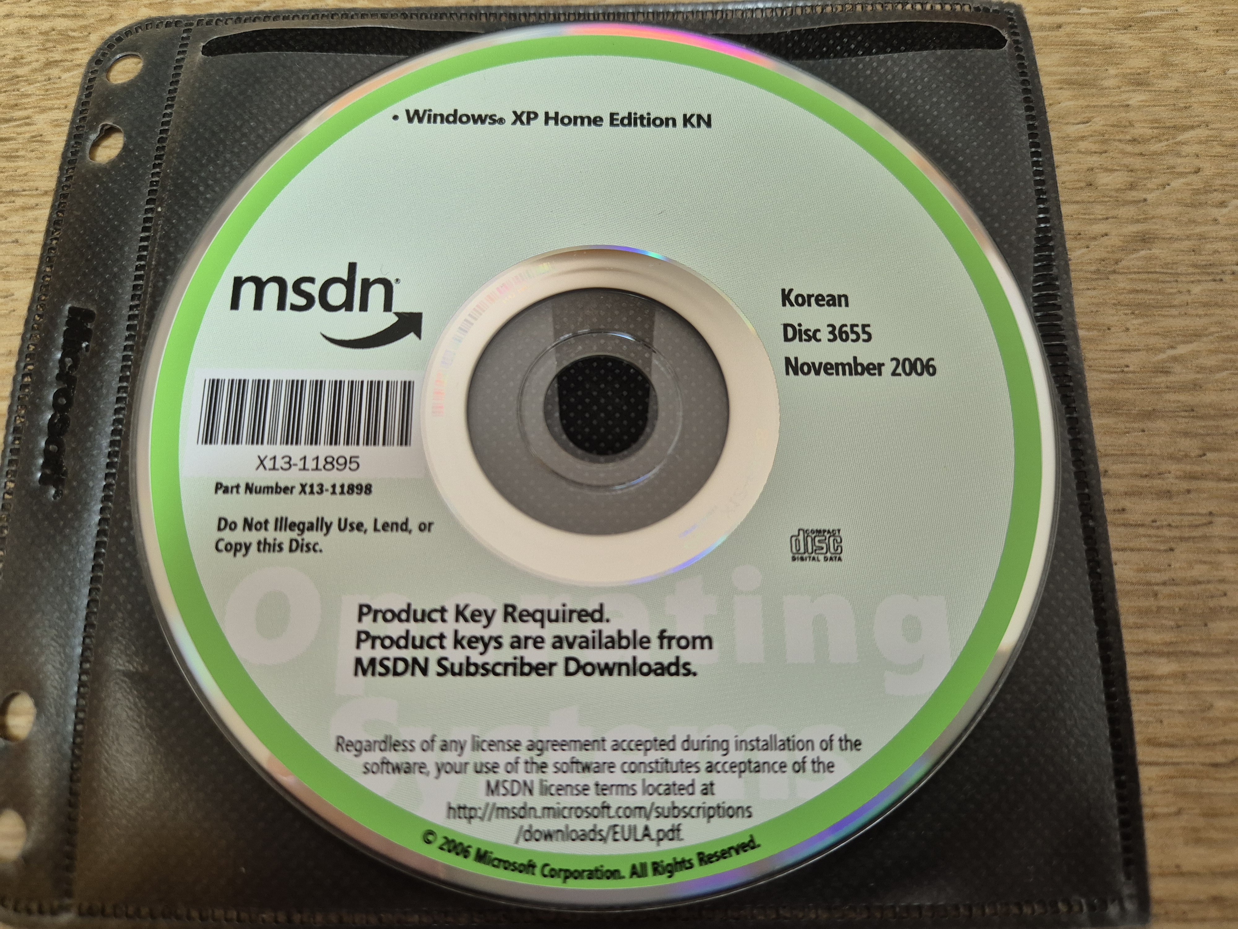 디스크의 모습입니다. 디스크 넘버는 3655이고, 파트 넘버는 X13-11898이며, CD 라벨명은 VX2HKNFPP_KO입니다. 2006년 11월에 나왔으며, 내용물은 윈도우 XP 홈 에디션 KN입니다. CD 표면에는 '이 디스크를 불법으로 사용, 양도 혹은 복사하지 말 것.' 이라는 문구와 '제품 키 필요함. 제품 키는 MSDN 구독자 다운로드에서 이용 가능함.' 이라는 문구가 적혀있습니다.