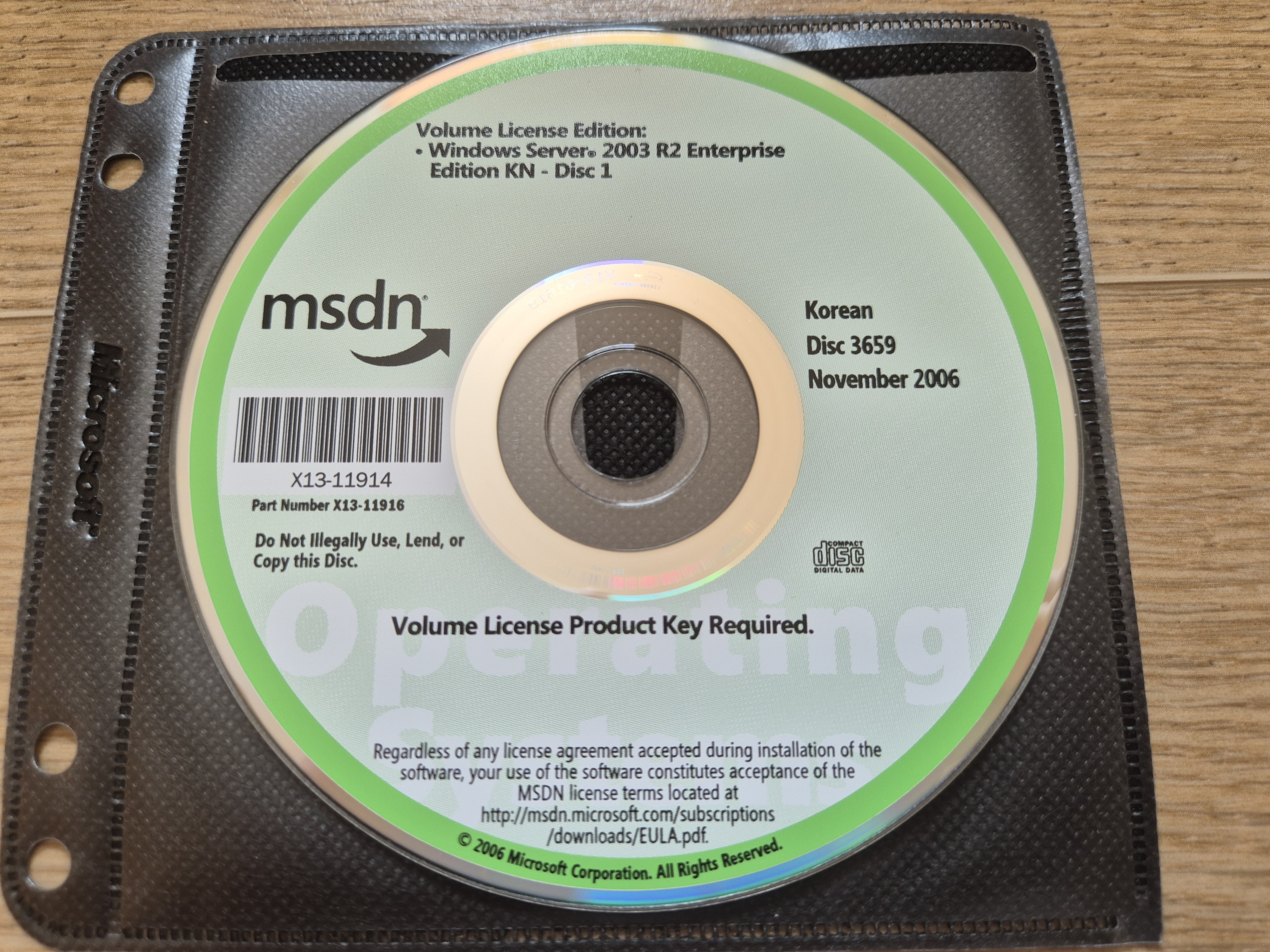 디스크의 모습입니다. 디스크 넘버는 3659이고, 파트 넘버는 X13-11916이며, CD 라벨명은 BX2EKNVOL_KO입니다. 2006년 11월에 나왔으며, 내용물은 윈도우 서버 2003 R2 엔터프라이즈 에디션 KN 볼륨 라이센스 버전입니다. CD 표면에는 '이 디스크를 불법으로 사용, 양도 혹은 복사하지 말 것.' 이라는 문구와 '볼륨 라이센스 제품 키 필요함.' 이라는 문구가 적혀있습니다.
