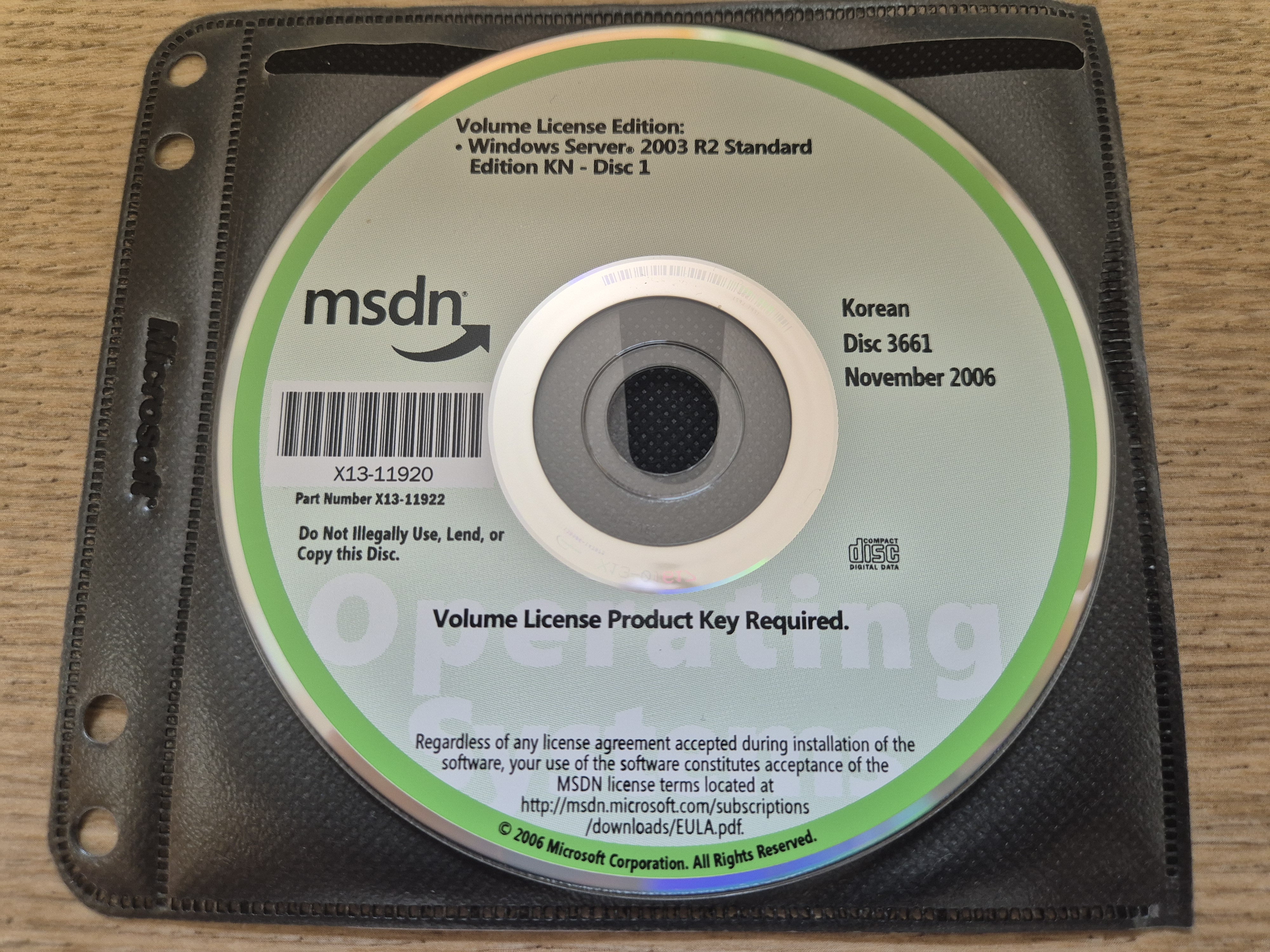 디스크의 모습입니다. 디스크 넘버는 3661이고, 파트 넘버는 X13-11922이며, CD 라벨명은 BX2SKNVOL_KO입니다. 2006년 11월에 나왔으며, 내용물은 윈도우 서버 2003 R2 스탠다드 에디션 KN 볼륨 라이센스 버전입니다. CD 표면에는 '이 디스크를 불법으로 사용, 양도 혹은 복사하지 말 것.' 이라는 문구와 '볼륨 라이센스 제품 키 필요함.' 이라는 문구가 적혀있습니다.