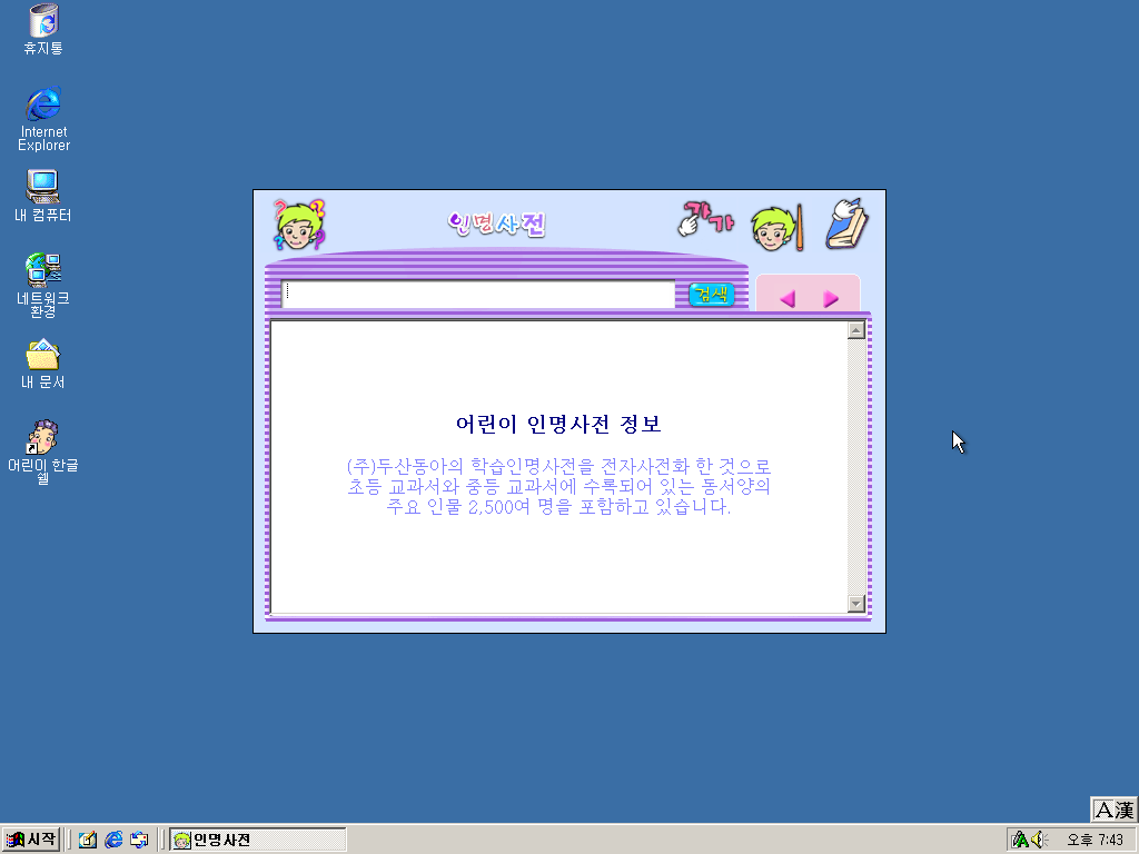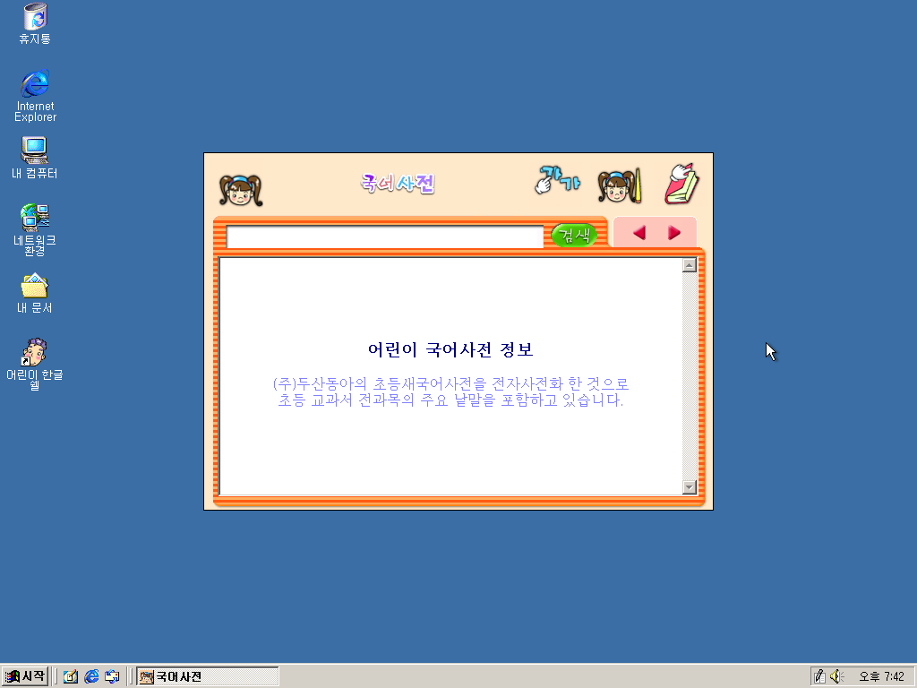 끄트머리에 앉아있는 여자애를 선택하면 어린이 사전이 실행됩니다.