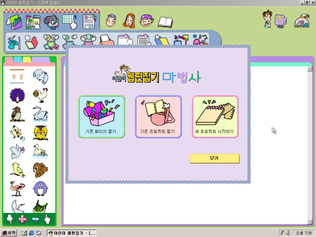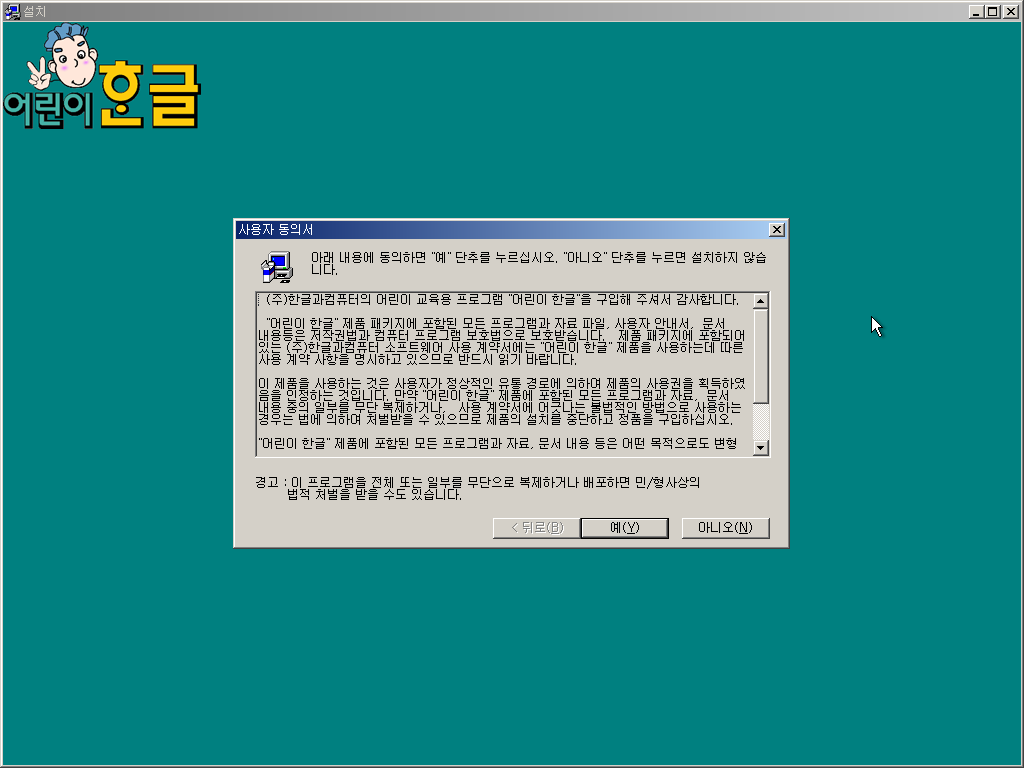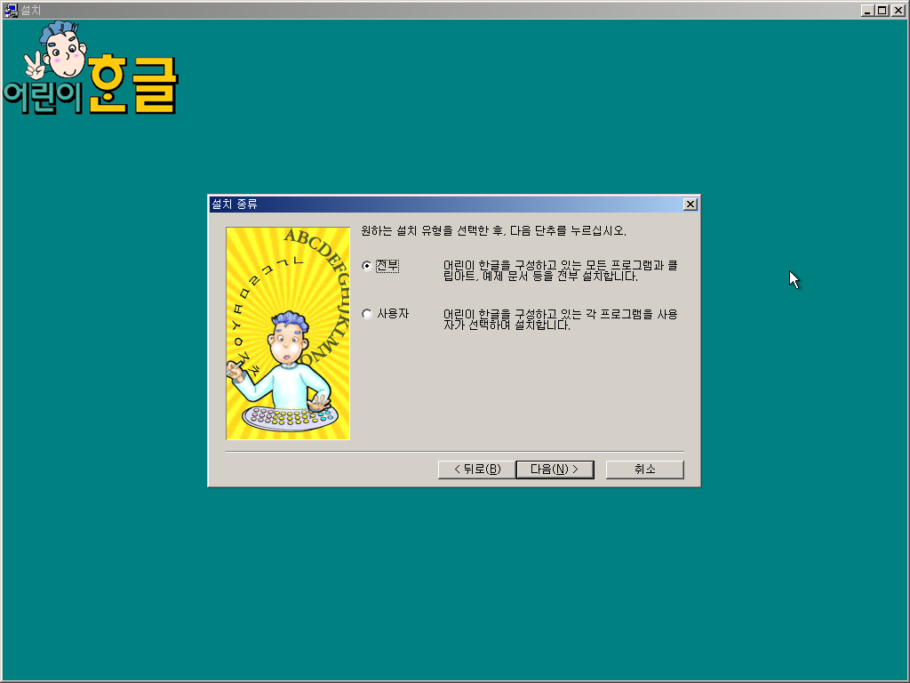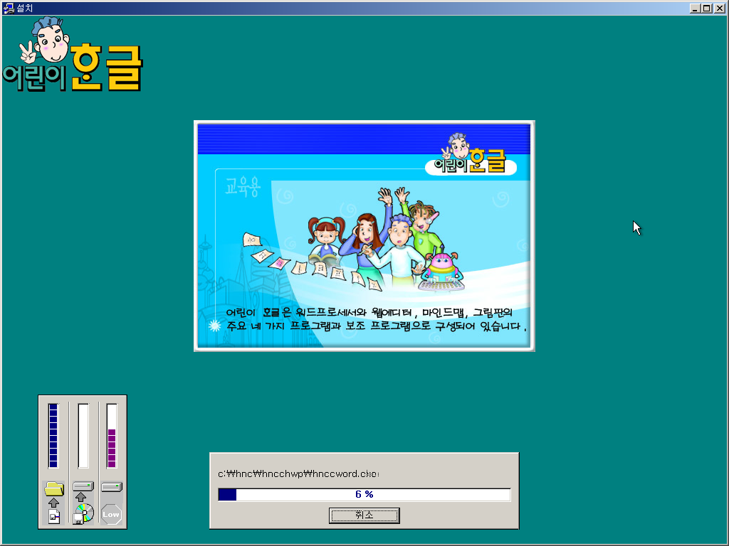 한글과컴퓨터 어린이 한글을 설치해보았습니다. 어린이 한글은 한글과컴퓨터에서 한글 97 기반으로 개발한 저연령층용 한글 소프트웨어로, 당시 경쟁 제품이던 삼성의 한글 워드프로세서 '훈민정음'의 저연령층용 프로그램 '어린이 훈민정음'을 의식해 개발한 버전입니다. UI나 기능 등이 어린이에게 특화되어 있습니다. 존재감이 진짜 없는 프로그램인데 우연히 알게 되어 파일을 얻어 설치해봤습니다.