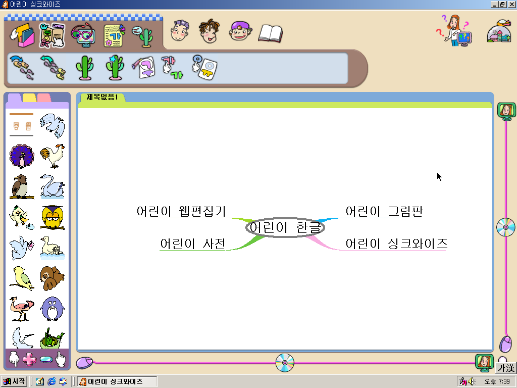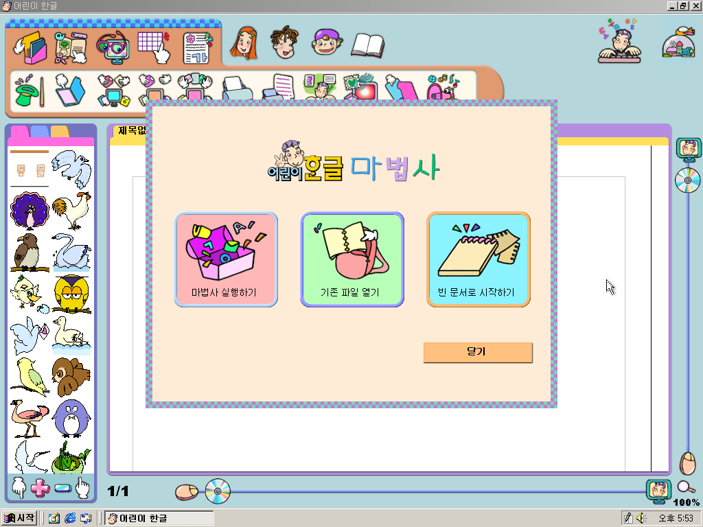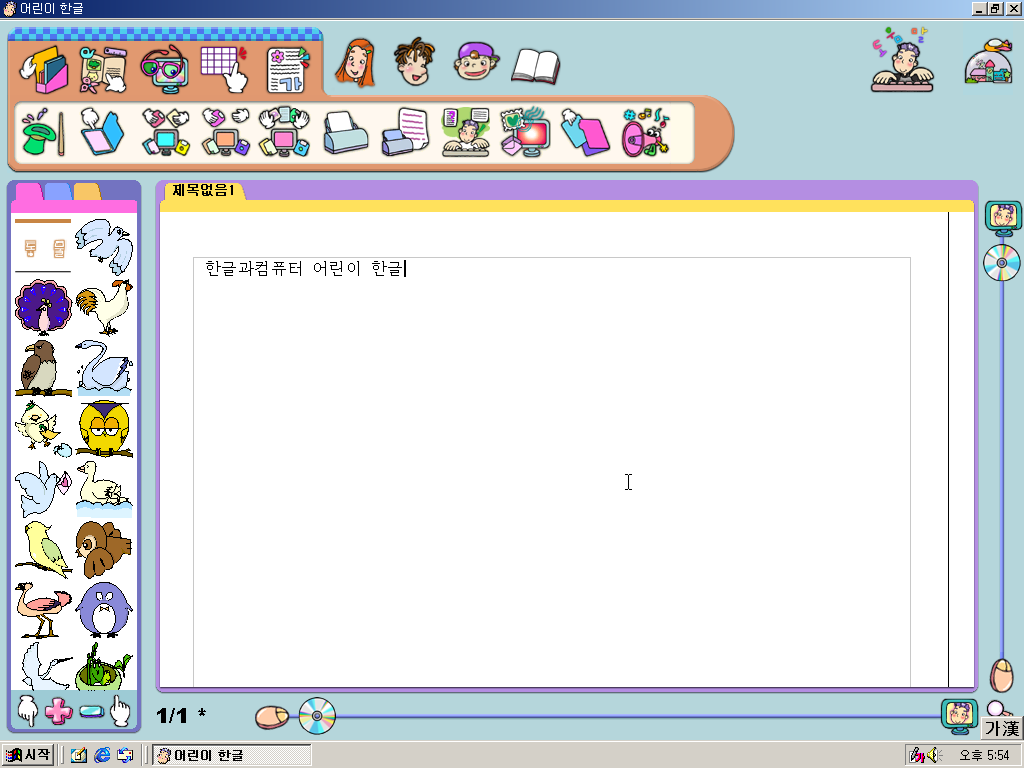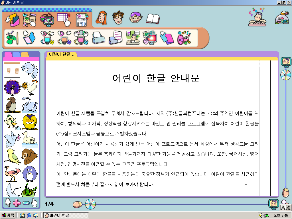 어린이 한글 실행 화면입니다. UI가 상당히, 매우 유치하고 촌스럽습니다. 아무리 애들을 겨냥해서 나온 프로그램이라고 해도 말이죠. 제가 초등학생이었어도 유치하다고 생각할 겁니다.