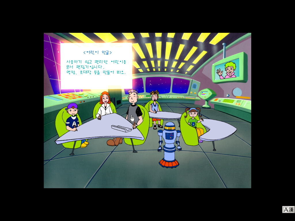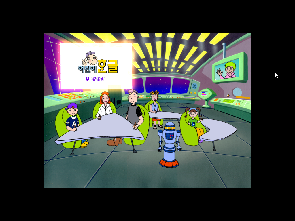 어린이 한글 쉘 화면입니다. 우주선에 애들이 앉아있네요 ㅋㅋㅋ