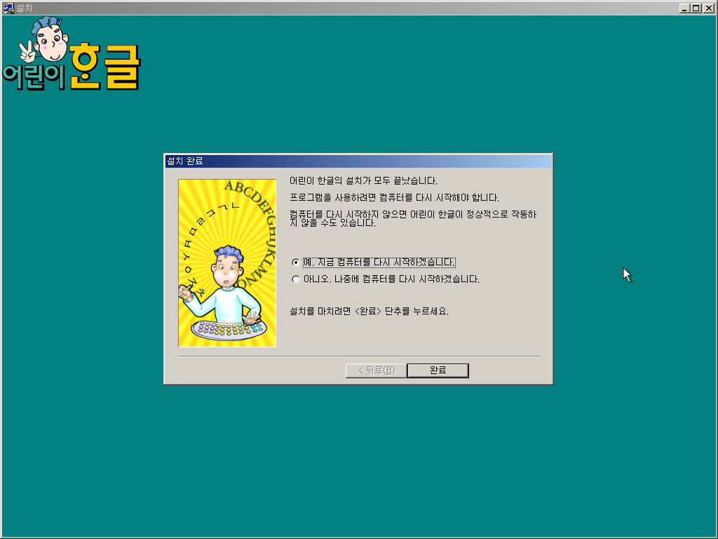 어린이 한글 설치가 끝났습니다. 예를 선택하여 시스템을 재부팅합니다.
