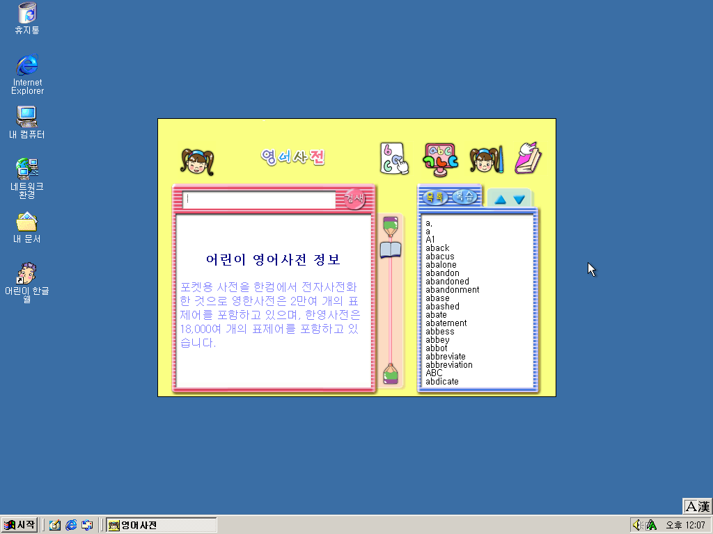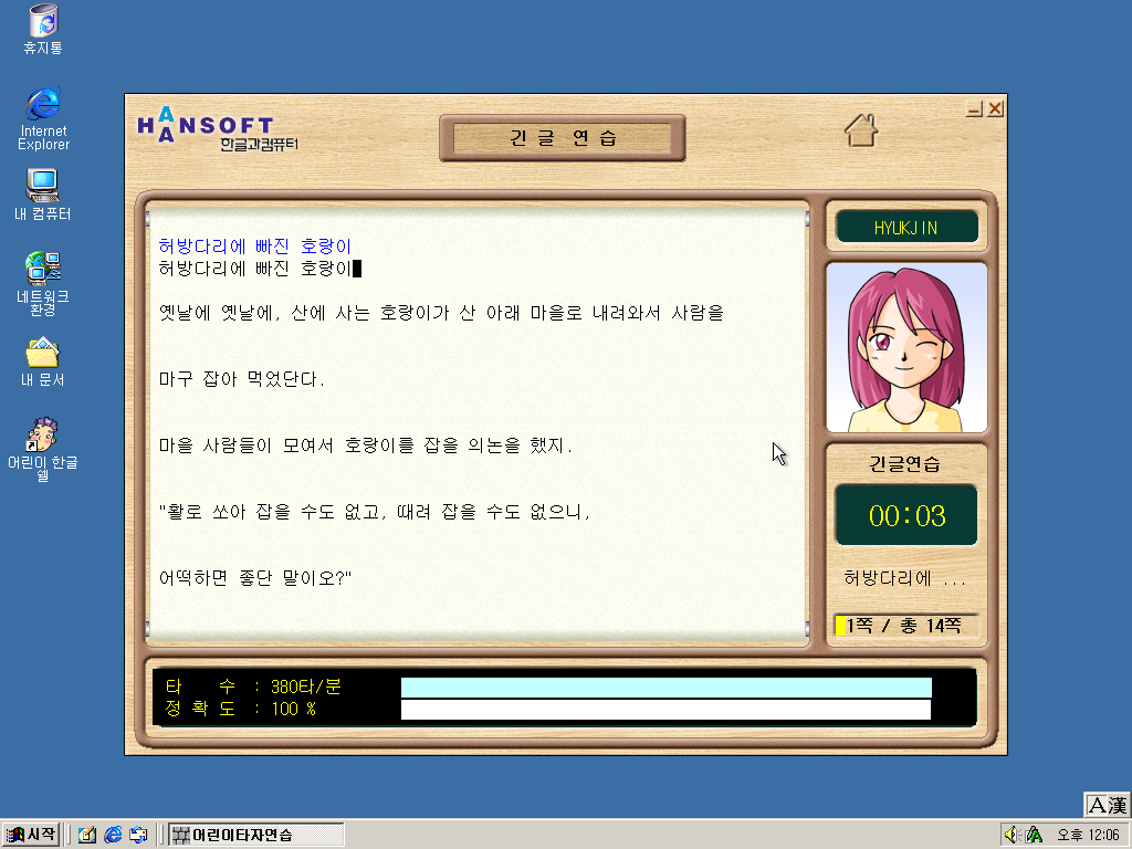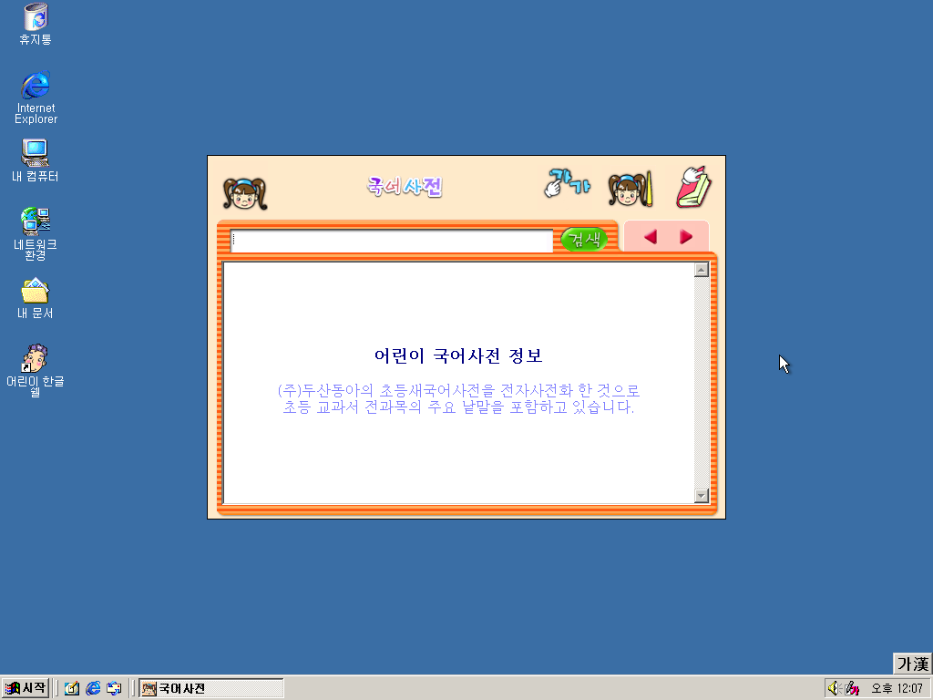 한글과컴퓨터 어린이 한글 기능개선판을 설치해보았습니다. 이전에 설치기를 올렸던 어린이 한글의 기능개선판입니다. 한글 97로 따지면 기능강화판인 셈이죠. 어린이 한글 기능개선판에서는 여러가지 기능이 추가되거나 개선되었는데, 가장 큰 차이점은 어린이 타자연습이 추가된 것입니다.