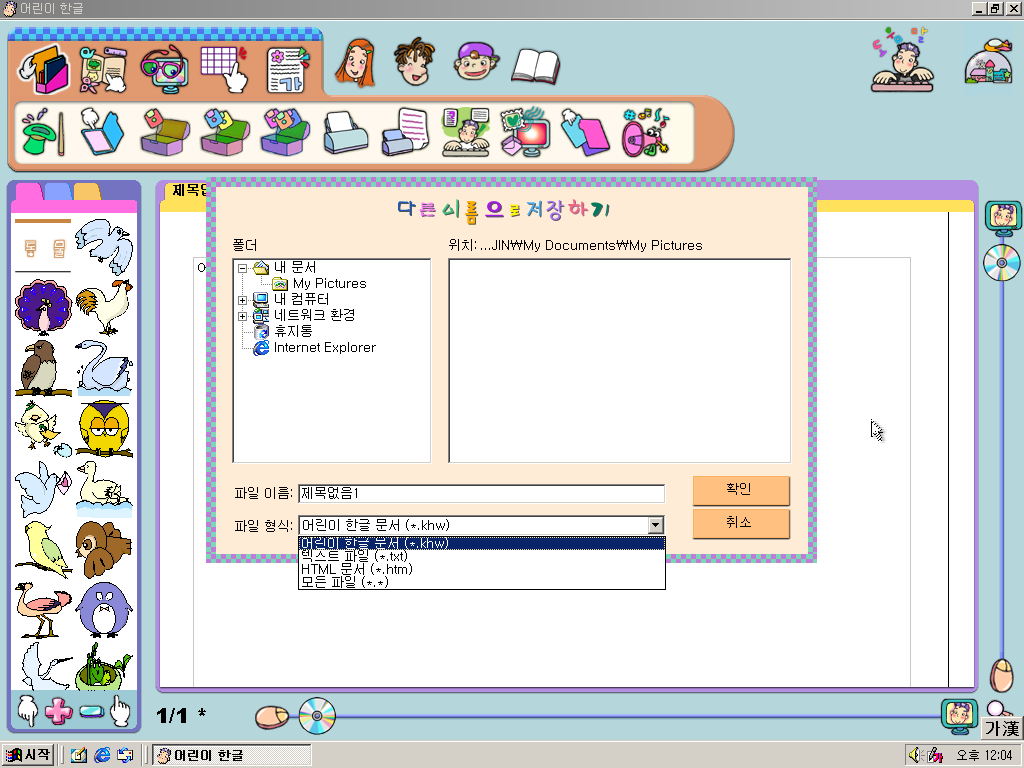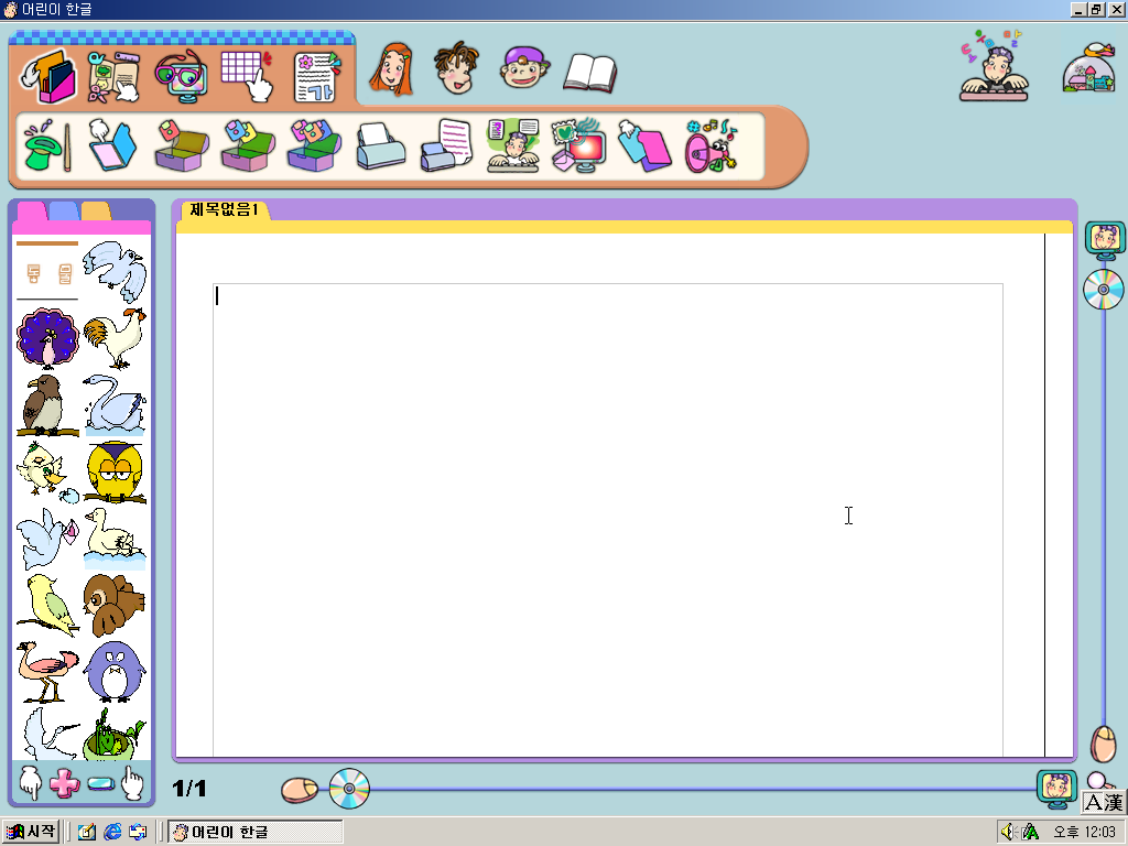 먼저 어린이 한글을 열어보았습니다. 일반판과 같습니다. 저장하기 아이콘이 이해하기 쉽게 바뀌었다고 하네요.