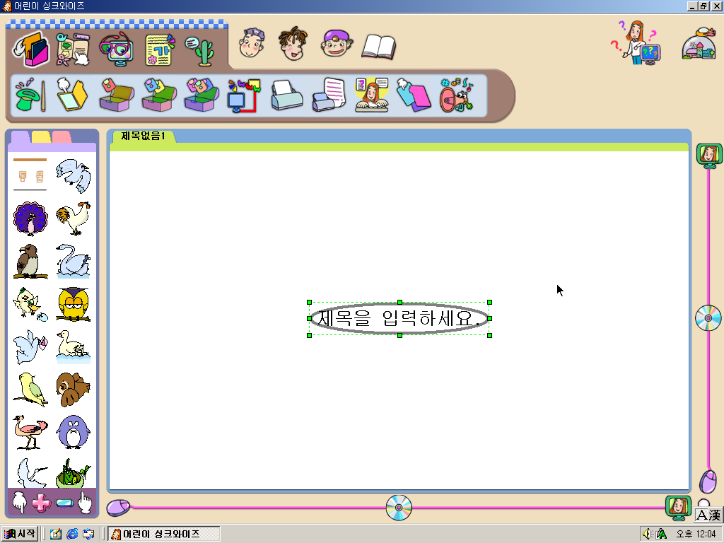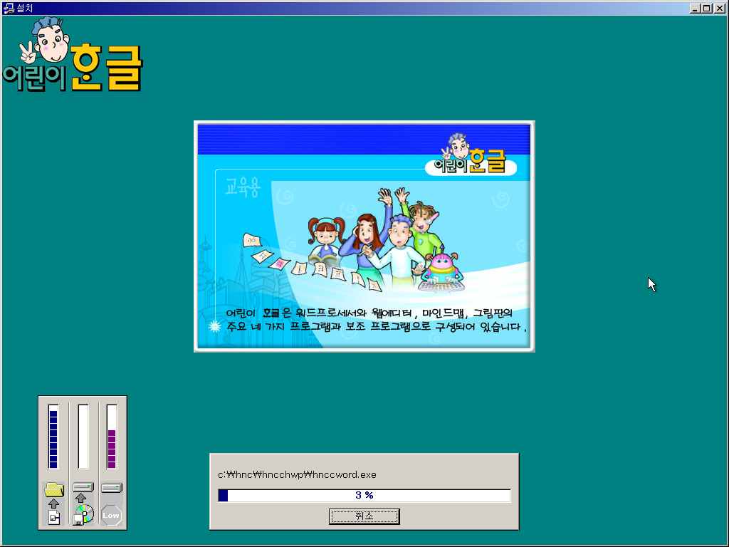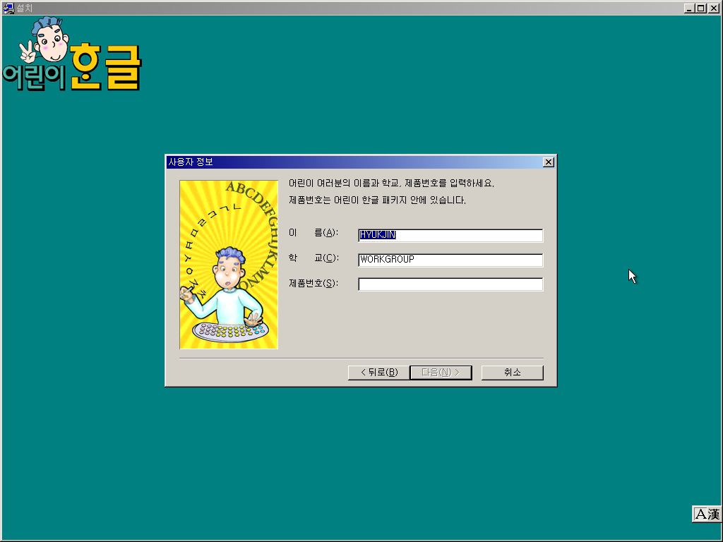 설치 CD를 넣으면 설치를 진행합니다. 어린이 한글 일반판과 비교하면 그림이 바뀌었습니다.
