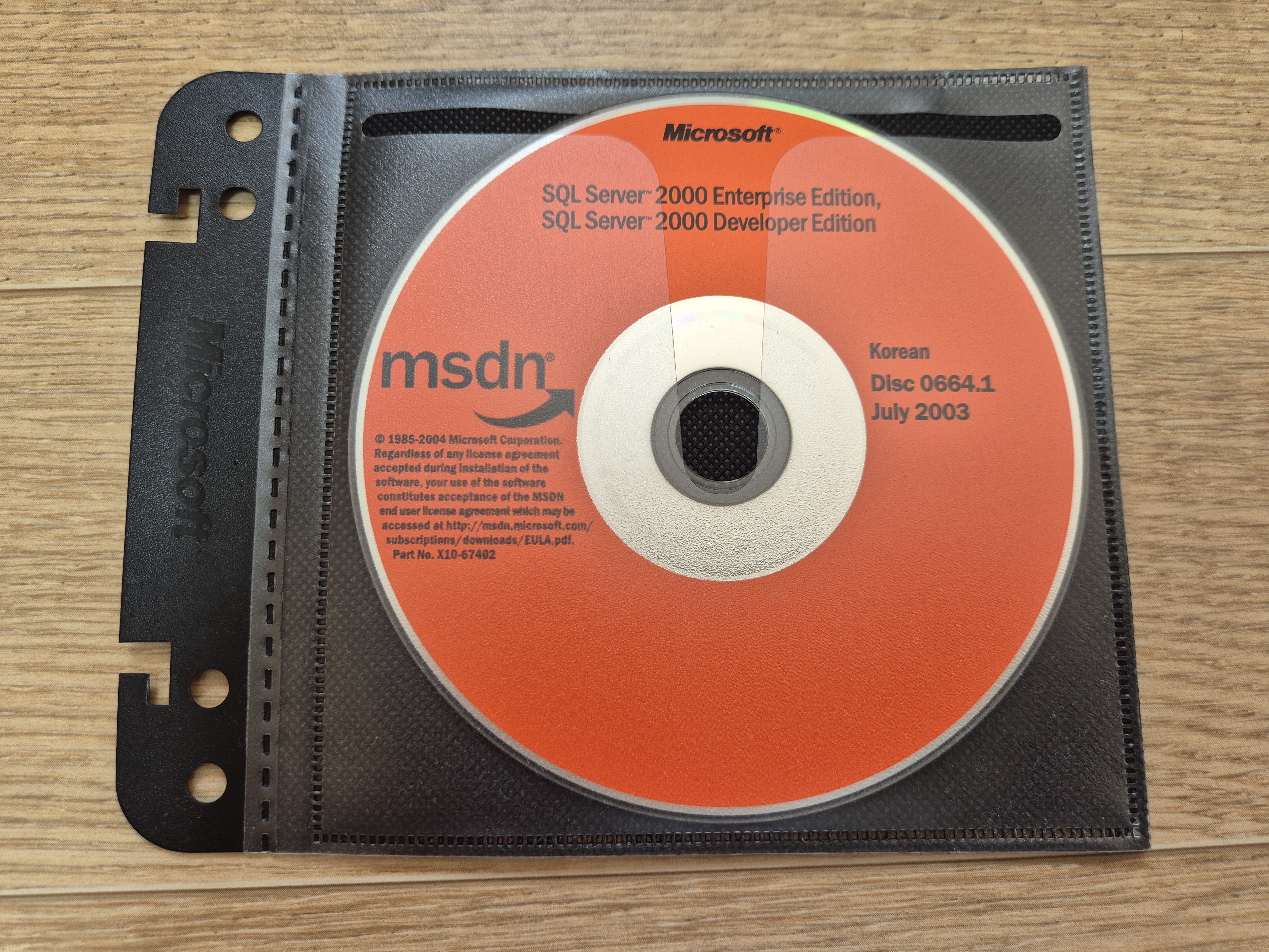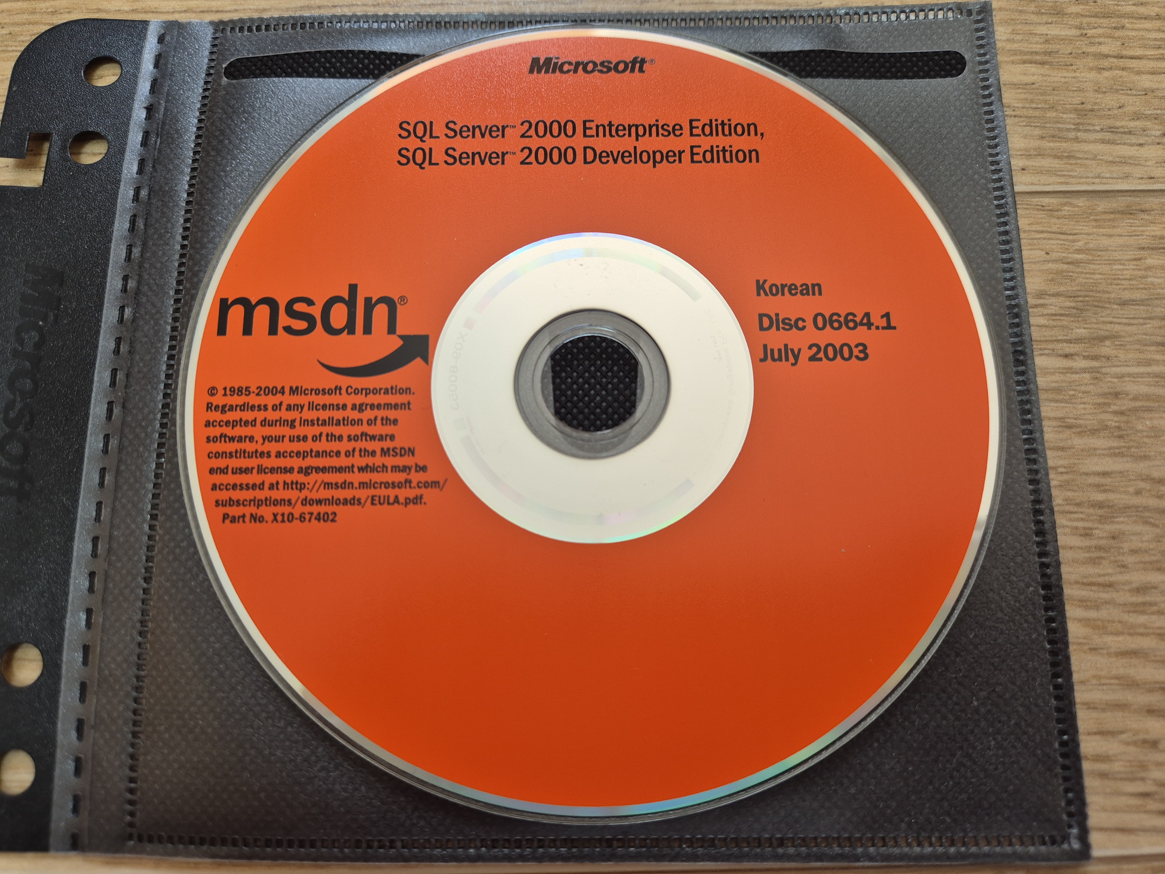 디스크의 모습입니다. 디스크 넘버는 0664.1이고, 파트 넘버는 X10-67402이며, CD 라벨명은 KO_SQL2K_ENT_DEV입니다. 이전까지 올렸던 디스크들과는 다르게 색이 주황색입니다. 2003년 7월에 나왔으며, 내용물은 SQL 서버 2000 엔터프라이즈 에디션과 SQL 서버 2000 디벨로퍼 에디션입니다. CD 표면 좌측에는 MSDN 로고와 사용권 계약서가 있습니다.
