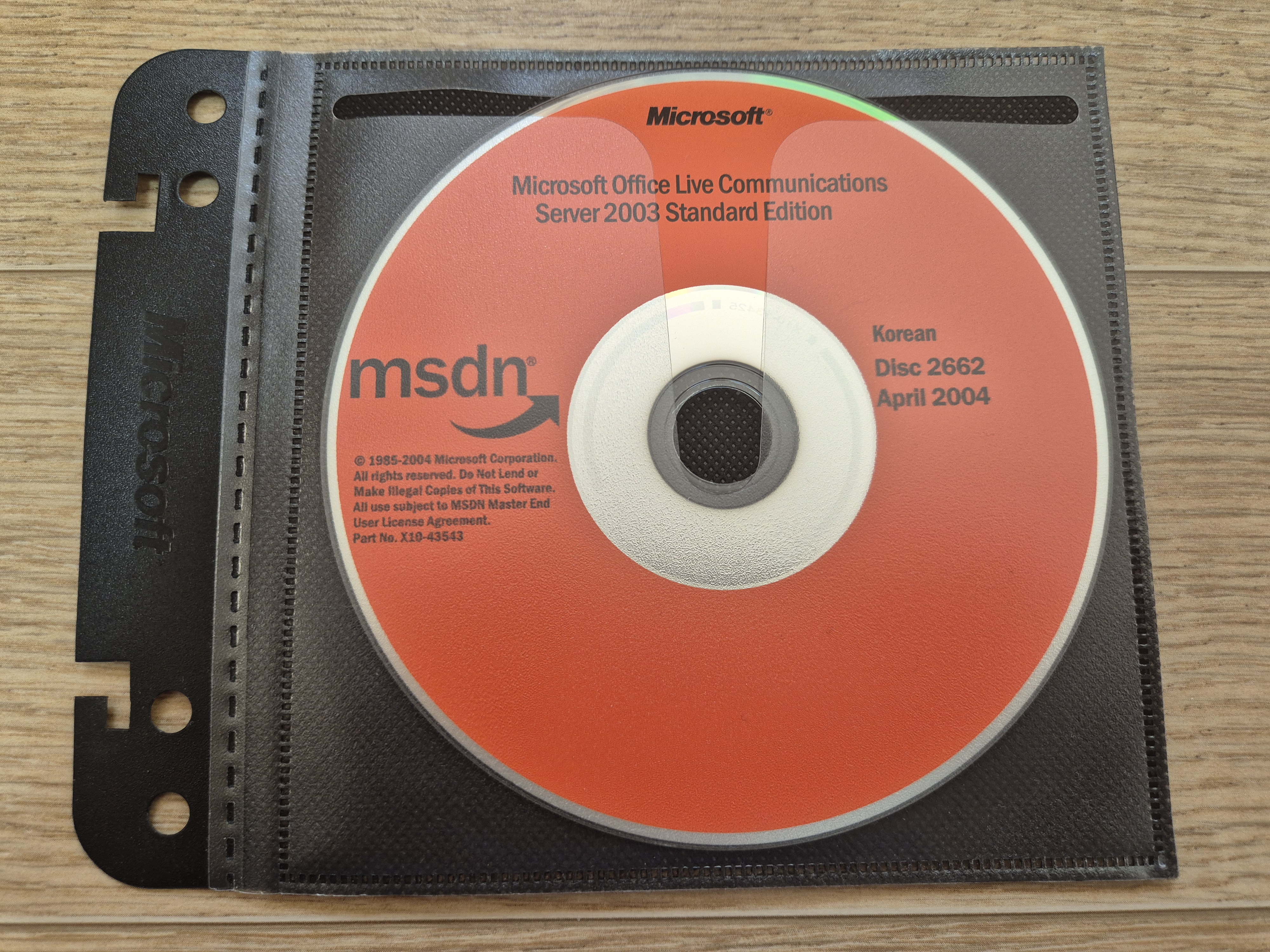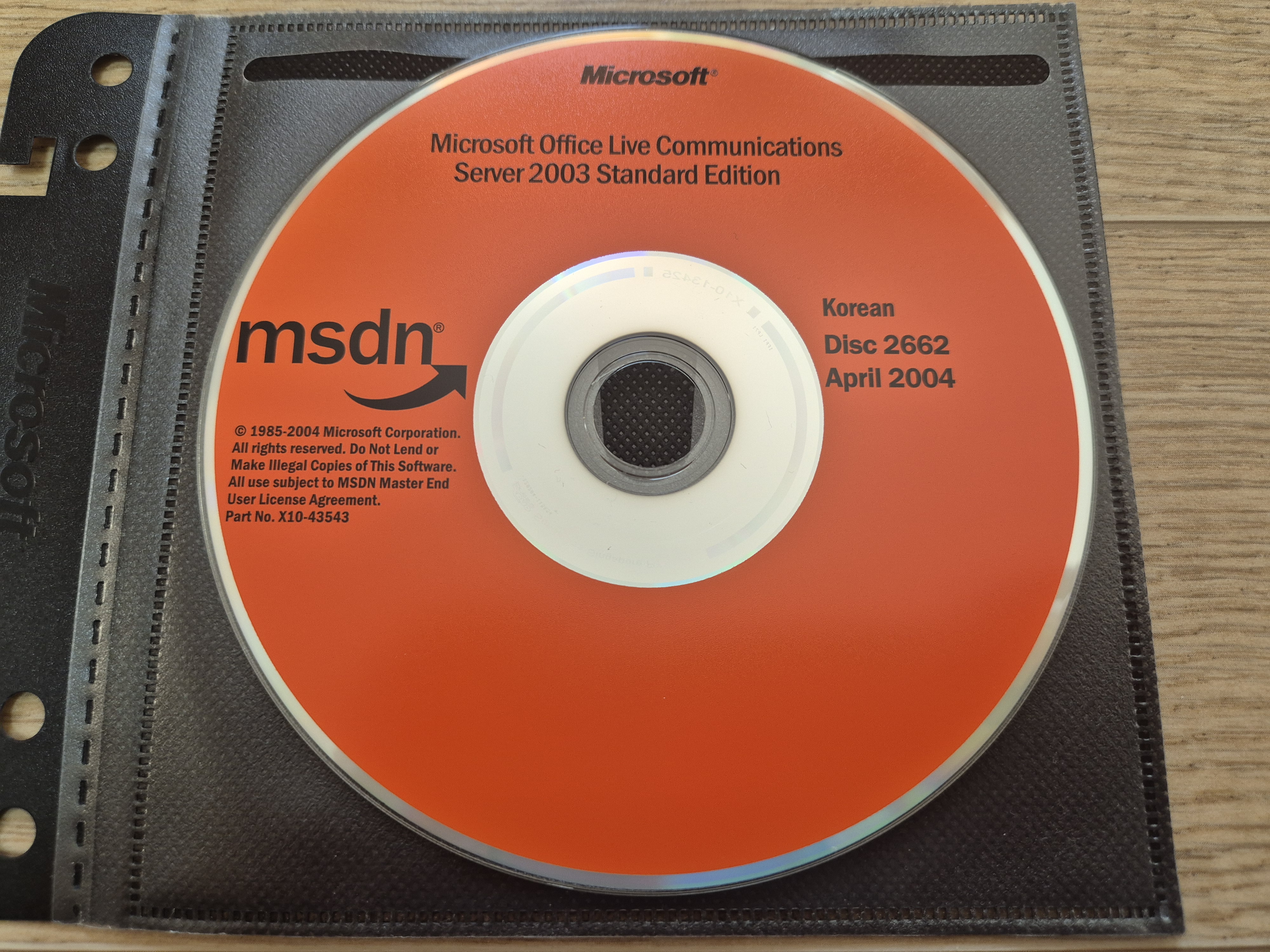 디스크의 모습입니다. 디스크 넘버는 2662이고, 파트 넘버는 X10-43543이며, CD 라벨명은 LCRTMKORMSDN입니다. 2004년 4월에 나왔으며, 내용물은 마이크로소프트 오피스 라이브 커뮤니케이션 서버 2003 스탠다드 에디션입니다. 이름이 참 기네요... ㅋㅋㅋ CD 좌측 표면에는 MSDN 로고와 사용권 계약서가 있습니다.