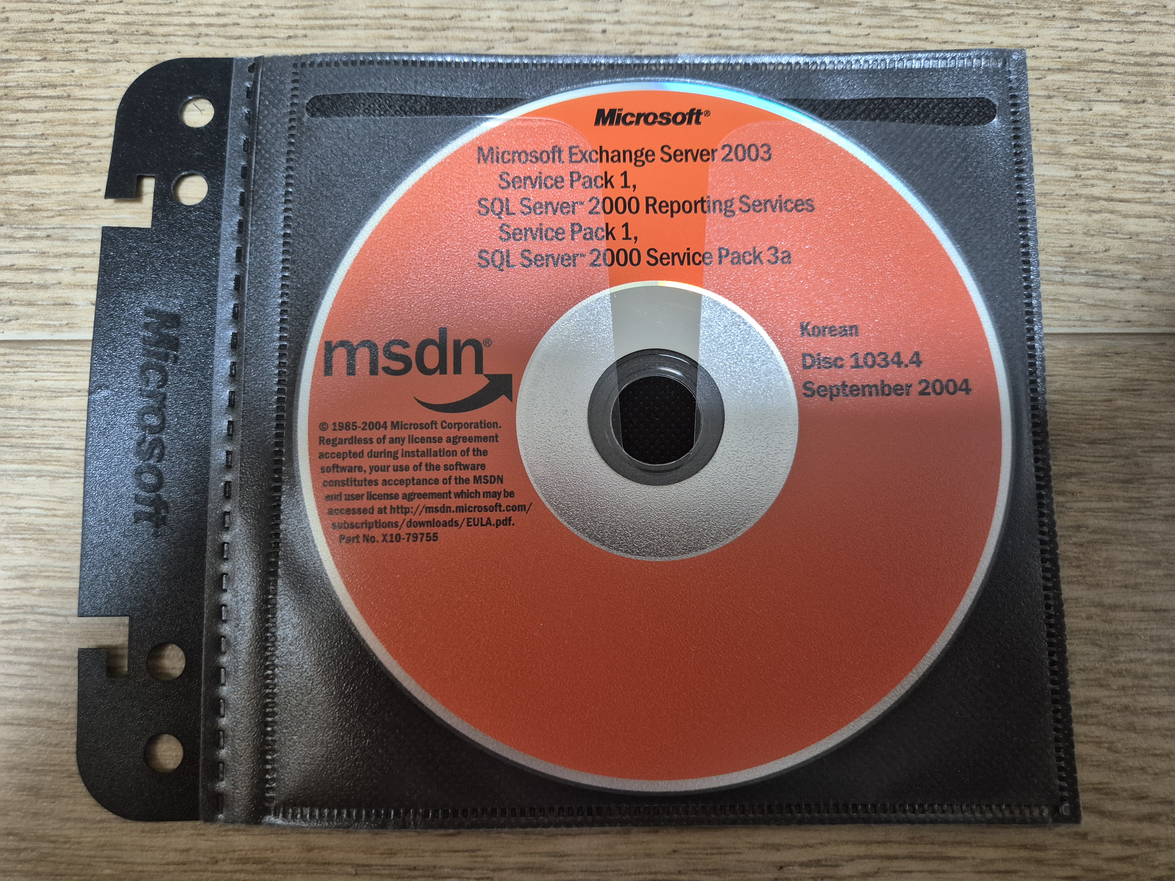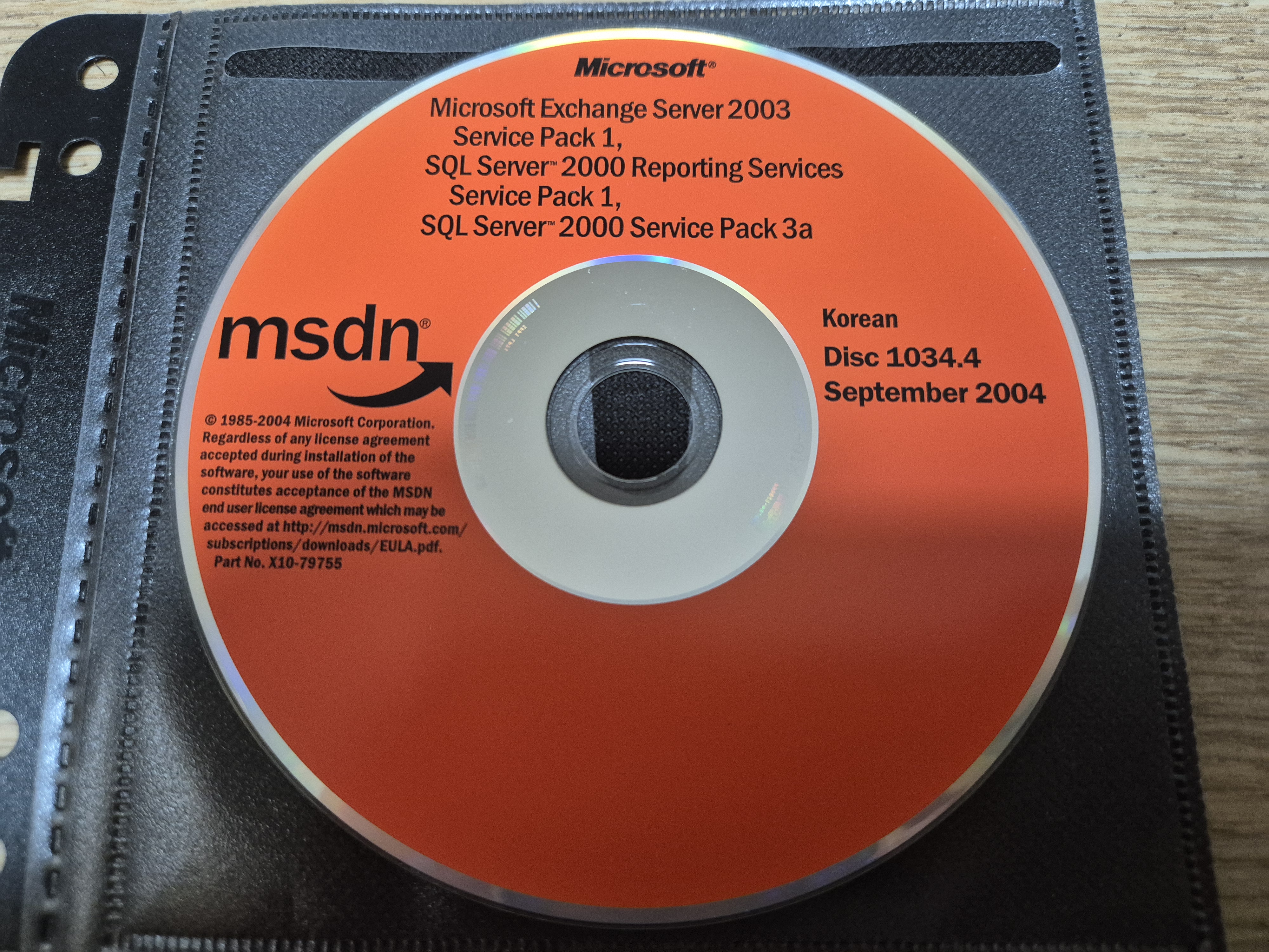 디스크의 모습입니다. 디스크 넘버는 1034.4이고, 파트 넘버는 X10-79755이며, CD 라벨명은 KO_SQL2KSP3입니다. 2004년 9월에 나왔으며, 내용물은 마이크로소프트 익스체인지 서버 2003 서비스 팩 1, SQL 서버 2000 리포팅 서비스 서비스 팩 1, SQL 서버 2000 서비스 팩 3a입니다. CD 좌측 표면에는 MSDN 로고와 사용권 계약서가 있습니다.