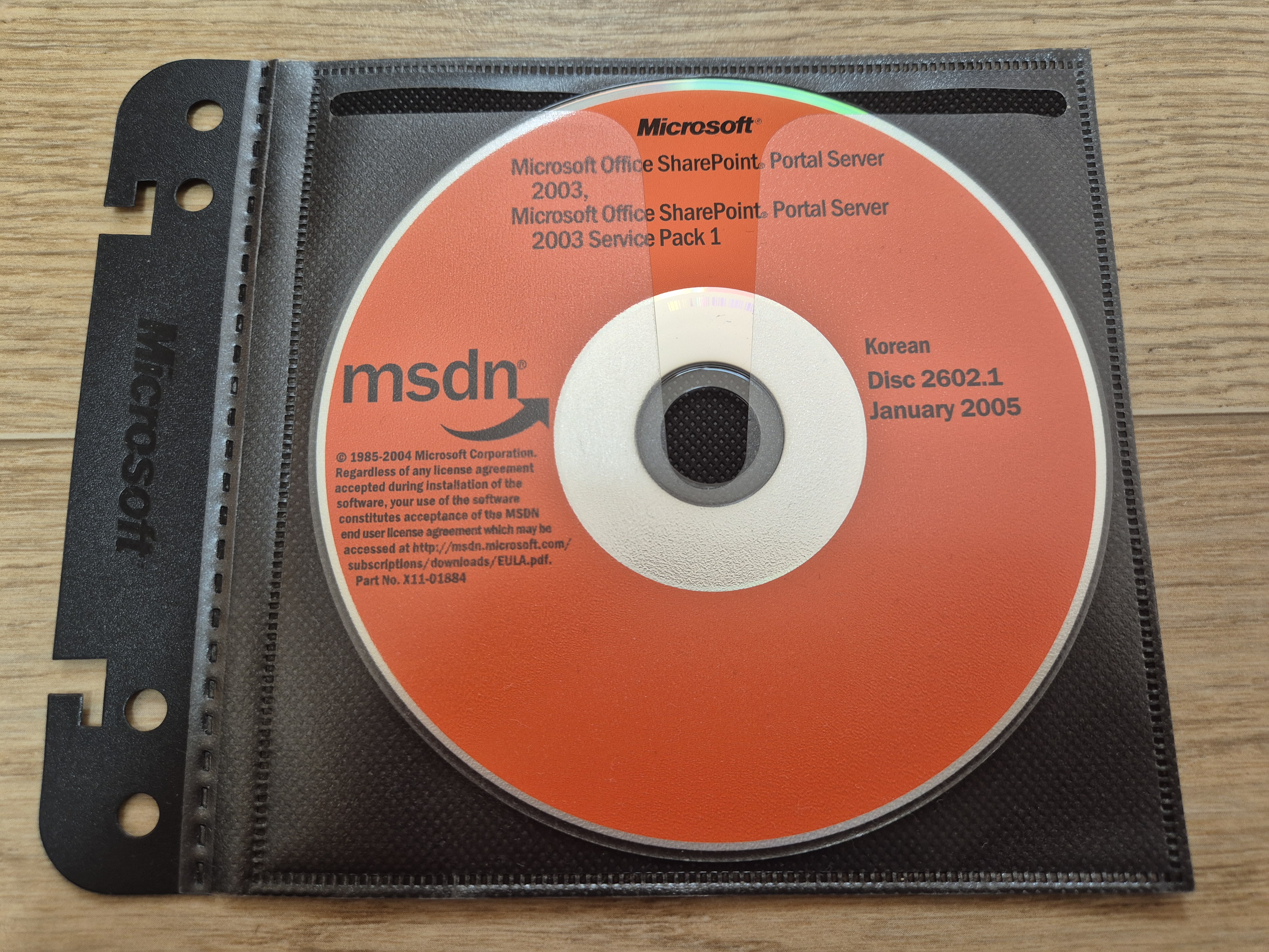 디스크의 모습입니다. 디스크 넘버는 2602.1이고, 파트 넘버는 X11-01884이며, CD 라벨명은 OFFICE11입니다. 2005년 1월에 나왔으며, 내용물은 마이크로소프트 오피스 셰어포인트 포털 서버 2003과 마이크로소프트 오피스 셰어포인트 포털 서버 2003 서비스 팩 1입니다. CD 좌측 표면에는 MSDN 로고와 사용권 계약서가 있습니다.