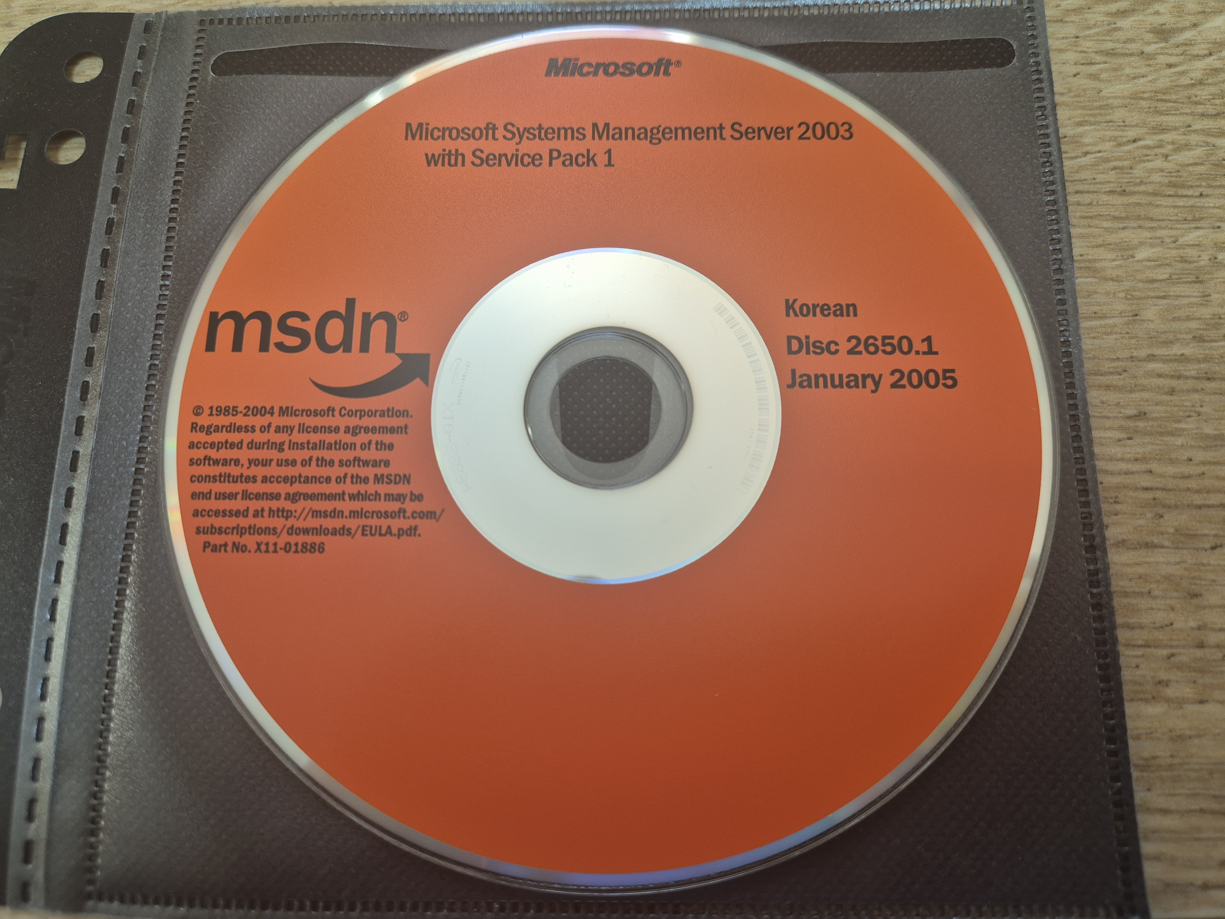 디스크의 모습입니다. 디스크의 넘버는 2650.1이고, 파트 넘버는 X11-01886이며, CD 라벨명은 SMS 2003 SP1 KOR입니다. 2005년 1월에 나왔으며, 내용물은 서비스 팩 1을 포함한 마이크로소프트 시스템 매니지먼트 서버 2003입니다. CD 좌측면에는 MSDN 로고와 사용권 계약서가 있습니다.