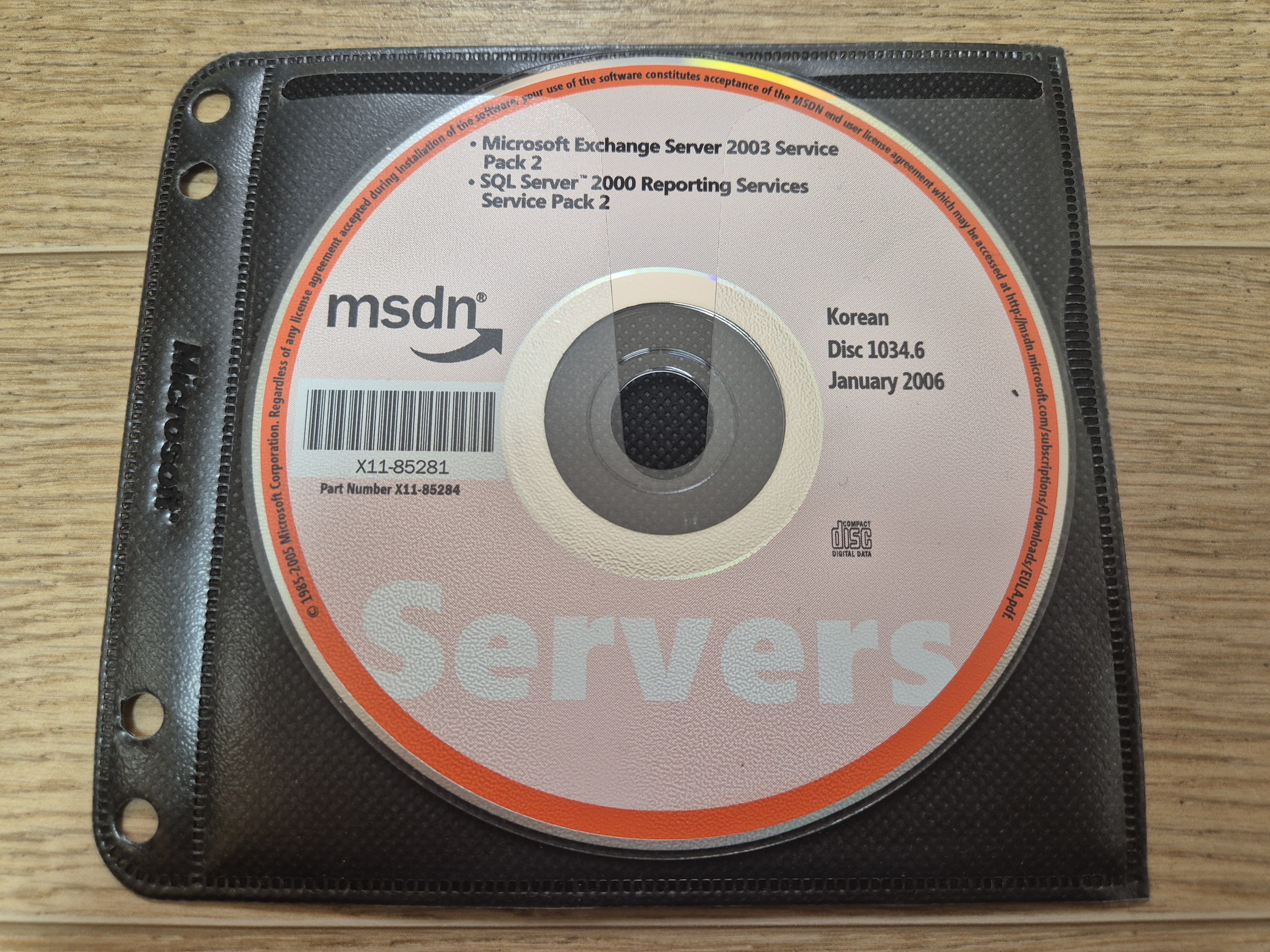 디스크의 모습입니다. 디스크 넘버는 1034.6이고, 파트 넘버는 X11-85284이며, CD 라벨명은 KO_EXCHSP2입니다. 2006년 1월에 나왔으며, 내용물은 마이크로소프트 익스체인지 서버 2003 서비스 팩 2와 SQL 서버 2000 리포팅 서비스 서비스 팩 2입니다. 디스크 좌측 표면에는 MSDN 로고가 있고, 하단에는 'Servers' 로고가 있습니다.