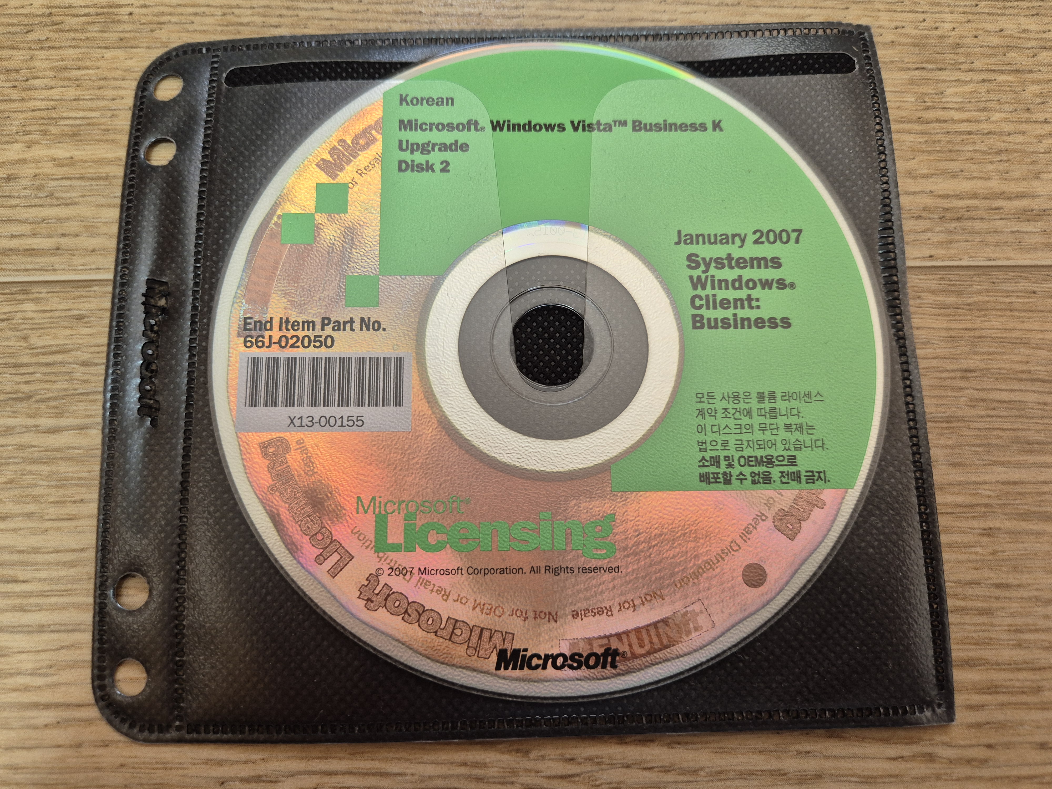디스크의 모습입니다. 미디어 파트 넘버는 X13-00155이고, 최종 상품 파트 넘버는 66J-02050이며, 디스크 라벨명은 LRMBVCCP_KO_CD2입니다. 2007년 1월에 나왔으며, 내용물은 윈도우 비스타 비즈니스 K 업그레이드 버전 2번 디스크입니다. 디스크 표면에는 홀로그램이 적용되어 있습니다. 디스크 표면 우측에는 '모든 사용은 볼륨 라이센스 계약 조건에 따릅니다. 이 디스크의 무단 복제는 법으로 금지되어 있습니다. 소매 및 OEM용으로 배포할 수 없음. 전매 금지.' 라는 문구가 적혀있습니다.