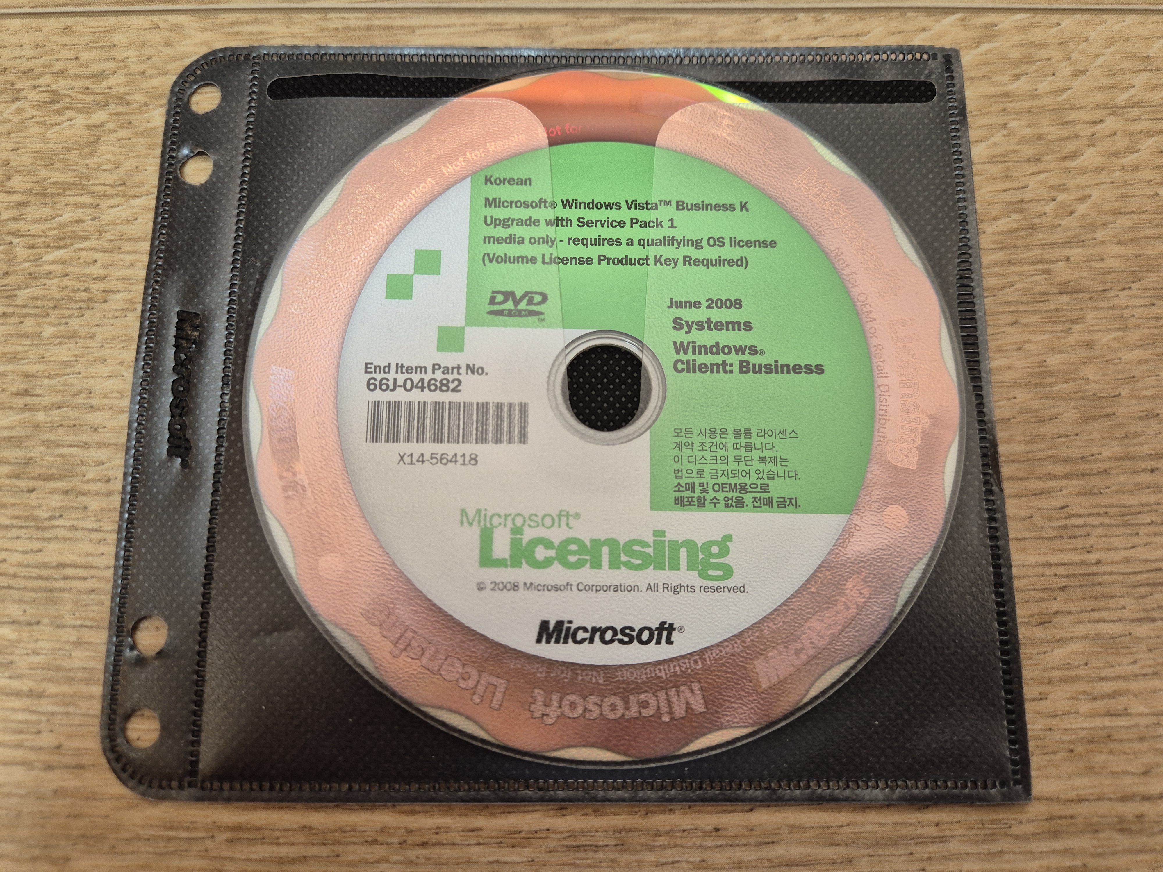 디스크의 모습입니다. 미디어 파트 넘버는 X14-56418이고, 최종 상품 파트 넘버는 66J-04682이며, 디스크 라벨명은 FRMBVCCP_KO_DVD입니다. 2008년 6월에 나왔으며, 내용물은 서비스 팩 1을 포함한 윈도우 비스타 비즈니스 K 업그레이드 버전입니다. 디스크에 적용된 홀로그램의 위치가 중앙에서 테두리로 바뀌었습니다. 볼륨 라이센스 버전이라서 운영체제 설명 밑에 '미디어만 있음 - 적합한 운영체제 라이센스가 필요함 (볼륨 라이센스 제품 키 필요함)' 이라고 적혀있습니다. 우측 하단에는 '모든 사용은 볼륨 라이센스 계약 조건에 따릅니다. 이 디스크의 무단 복제는 법으로 금지되어 있습니다. 소매 및 OEM용으로 배포할 수 없음. 전매 금지.' 라고 적혀있습니다.