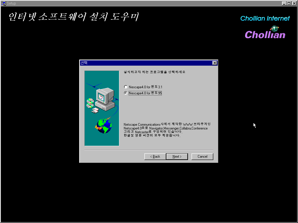 천리안에서 내놓은 인터넷 소프트웨어 설치 도우미입니다. 넷스케이프 4.0, 인터넷 익스플로러 4.0, 그릭 다이얼러, 에어 어택 게임, 비보액티브 플레이어, 바벨 2.0 라이트, 한컴 다이얼러와 같은 여러가지 인터넷 관련 소프트웨어들을 설치할 수 있습니다. 136MB 디스크 이미지 파일입니다.