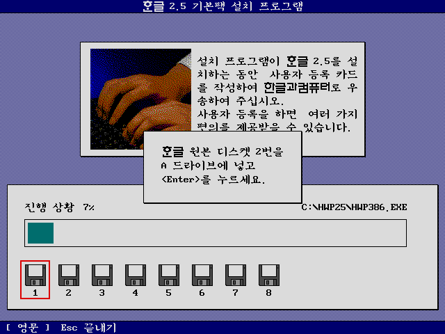 2번 설치디스크를 넣어줍니다. 한글 2.5는 설치디스크가 8장입니다.