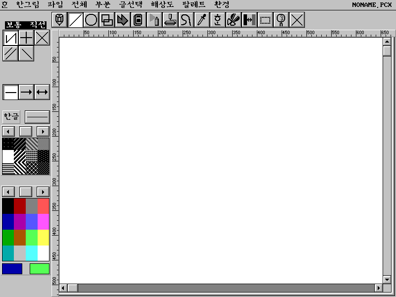 한그림의 모습입니다. 딱 그림판 같습니다. 에러라면 마우스 드라이버가 깔려있지 않아서 아무것도 그릴 수가 없네요.. 아쉽습니다. 해상도는 최대 1024x768까지 할 수 있습니다. 이 시대 모니터들에겐 과분하죠.