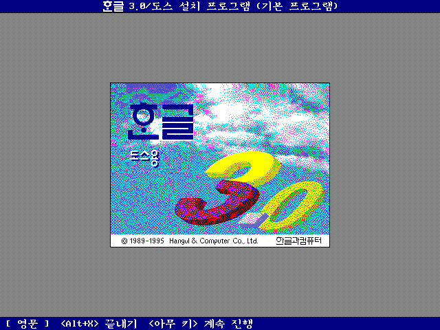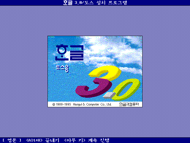 한글 3.0 도스용 설치를 시작합니다. 로고가 하늘하늘하네요.