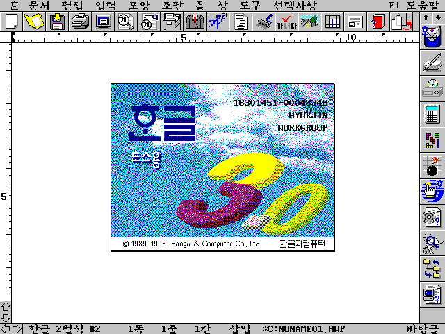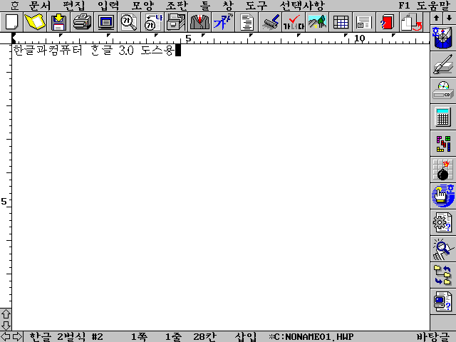 한글과컴퓨터 한글 3.0을 설치해보았습니다. 한글 3.0부터는 그래픽 UI를 적용하여 좀 더 컬러풀하게 되었고, 툴바가 생겨서 본격적으로 마우스를 지원하게 됩니다. 사실 한글 3.0은 95년 3월에 윈도우 (윈도우 3.1)용이 먼저 발매되었습니다. 그러나 당시에는 도스로 부팅해 윈도우를 실행하는 방식이었고, 아직 도스를 사용하는 사람들이 많던 시기라서 윈도우용은 번거로운데다가 쓸데없이 무겁고 버그도 많았다고 합니다. 결국 4개월 뒤에 도스용 3.0도 나오게 됩니다.