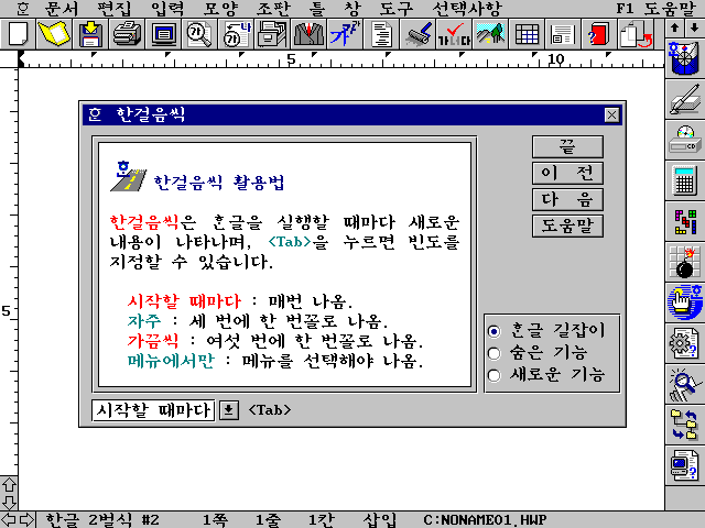 한글 3.0을 실행해보았습니다. 시작화면에 도움말이 나오는군요.