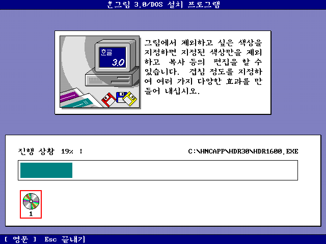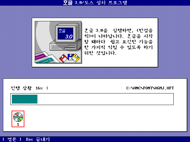 참고로 한글 3.0 도스용은 CD판도 있습니다. 나중에 CD판을 얻게 되었는데, CD판으로 설치하게 되면 다음과 같이 CD 그림이 나옵니다. 번거롭게 플로피를 갈아끼울 필요도 없죠. CD판은 후술할 꾸러미까지 모두 포함된 디스크입니다.