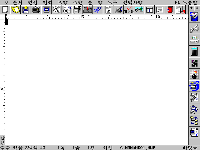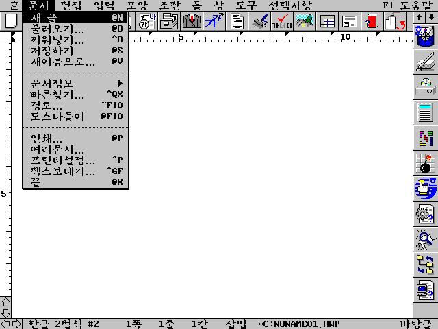 한글 3.0 도스용의 모습입니다. 형형색색의 아이콘을 가진 메뉴 툴바가 생겨서 이제 좀 프로그램 같아 보입니다.