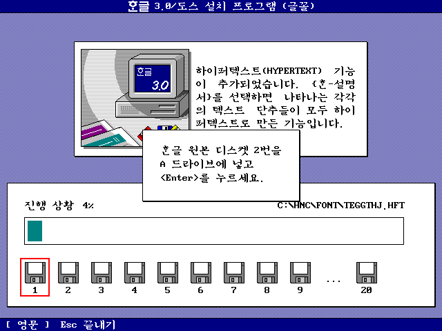 한그림 설치가 끝난 후 마지막으로 한글 3.0 확장 글꼴을 설치해줍니다. 제가 활동하는 카페의 지인 분께서 귀한 자료를 입수하셔서 올려주신 덕분에 확장 글꼴 디스켓도 설치할 수 있었습니다.