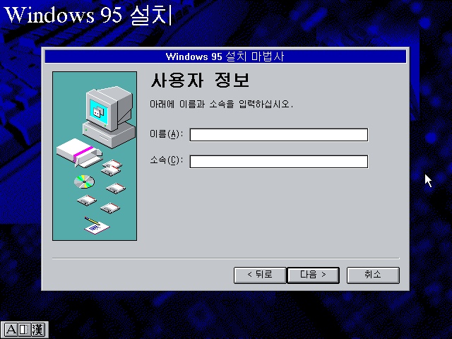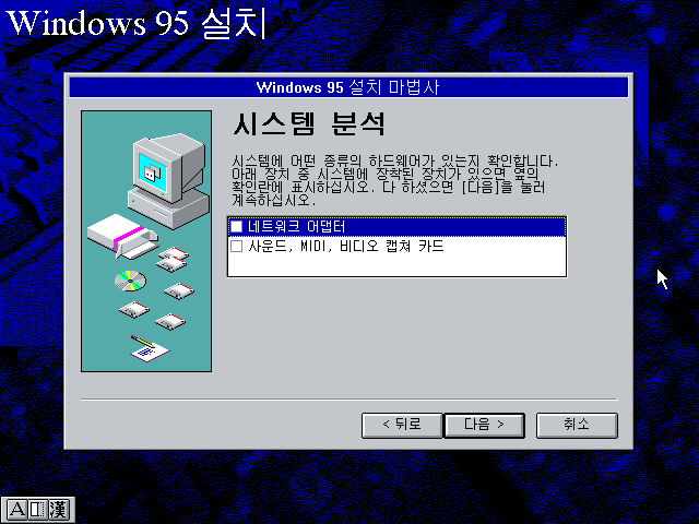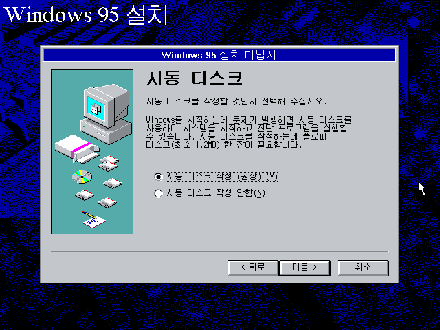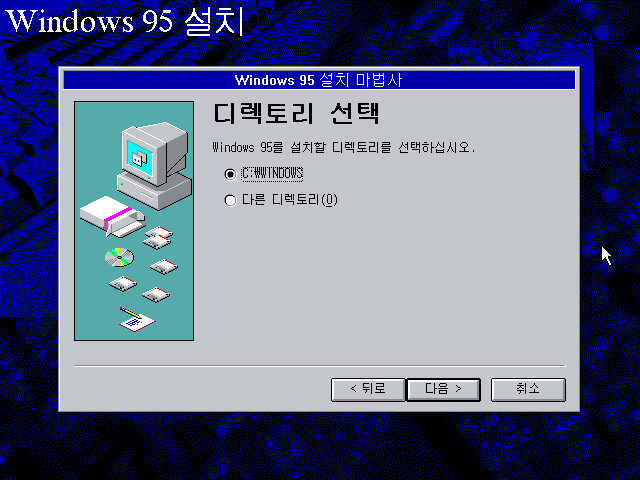 윈도우 95 설치 마법사입니다. 다음을 누릅니다.
