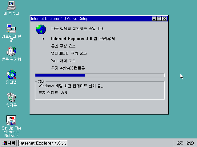IE 4.0을 설치하는 중입니다. 설치가 끝나면 재시작합니다.