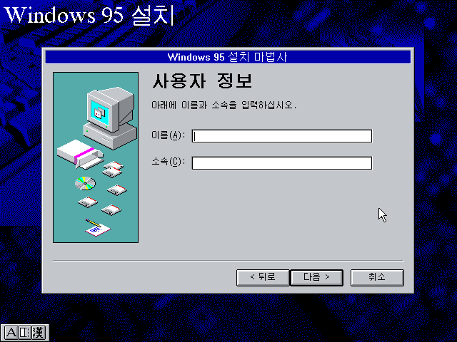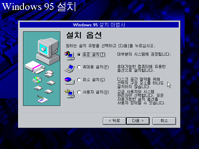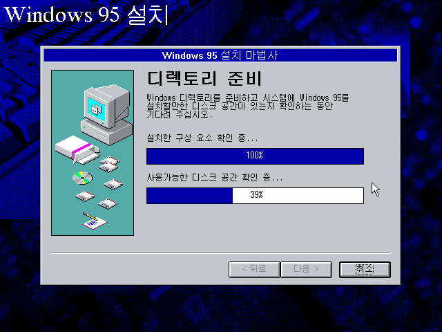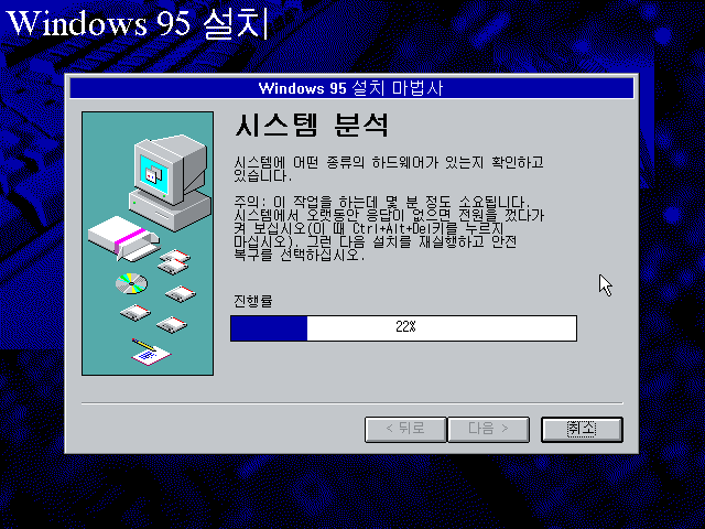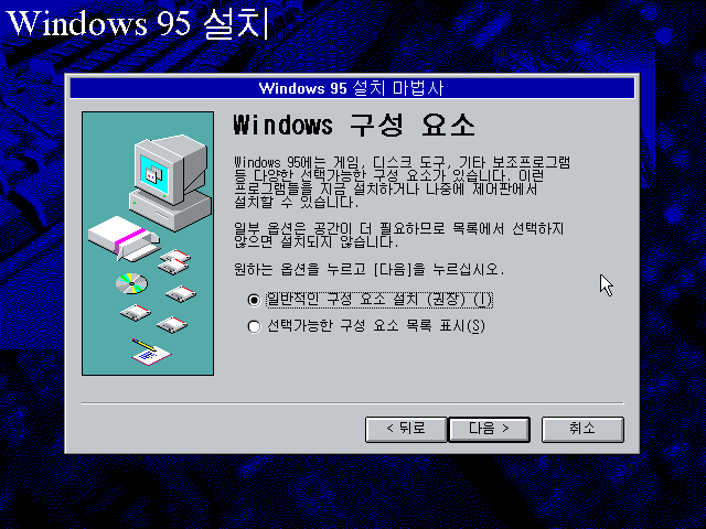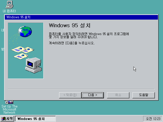 윈도우 95 설치 마법사입니다. 다음을 누릅니다.