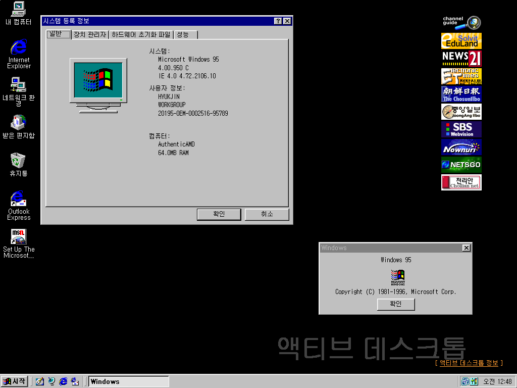 시스템 등록 정보입니다. 윈도우 95 OSR2.5입니다. 빌드 넘버는 4.00.950C입니다. 인터넷 익스플로러 버전과 빌드 넘버도 같이 나오네요.