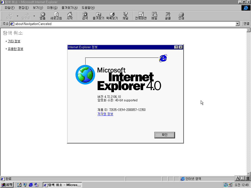 인터넷 익스플로러입니다. 버전 4.01입니다. 빌드 넘버는 4.72.2106.10입니다. 메뉴 툴바가 점점 친숙해지는 모습입니다.