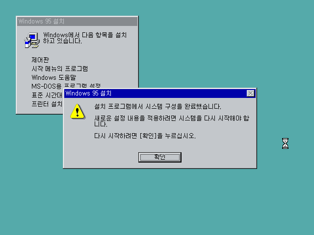 윈도우 95의 설치가 끝났습니다. 확인을 눌러 시스템을 재시작합니다.