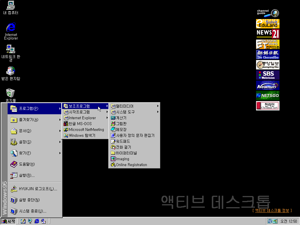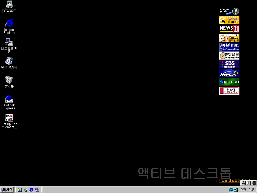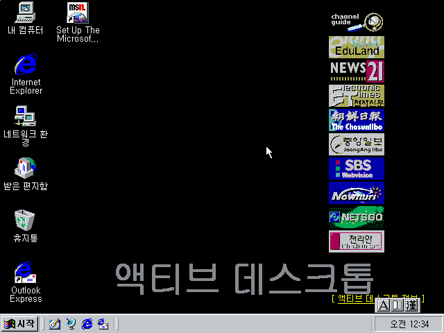 그래픽 드라이버를 설치한 후의 바탕화면입니다. IE 4.0을 설치하게 되면 작업표시줄에 빠른 실행 아이콘이 생기고, 액티브 데스크톱이 실행됩니다. 액티브 데스크톱은 바탕화면을 웹페이지나 GIF로 할 수 있는 기능인데, 사실 컴퓨터가 느려지게 하는 주요 원인이라서 안 쓰는 사람들이 많았습니다. 또 바탕화면 우측의 인터넷 채널바도 눈에 띕니다. 그 시절의 뉴스 사이트들이 보이네요. IE 4.0을 기본으로 탑재한 윈도우 98 오리지널의 모습과 거의 비슷합니다.