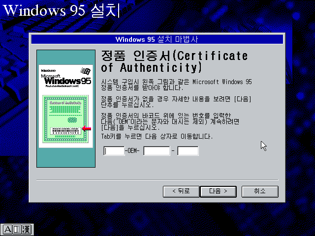 윈도우 95 설치를 시작합니다. 환영 문구는 OSR2와 동일합니다. 뭐 설치 파일이 같으니까요 ㅋㅋ