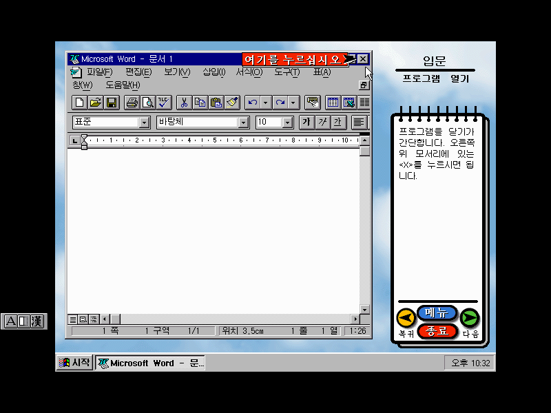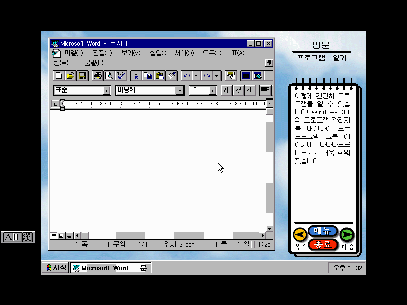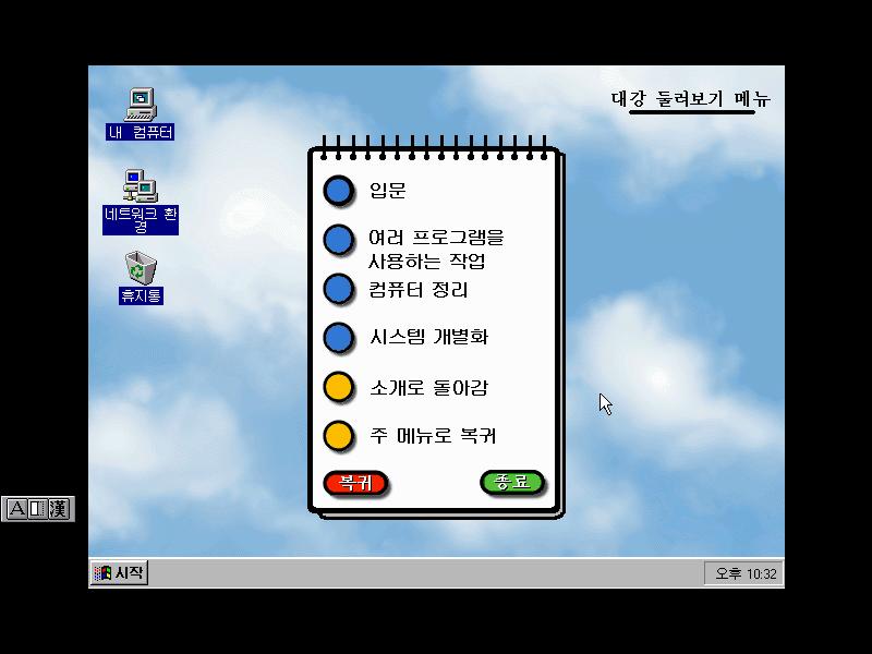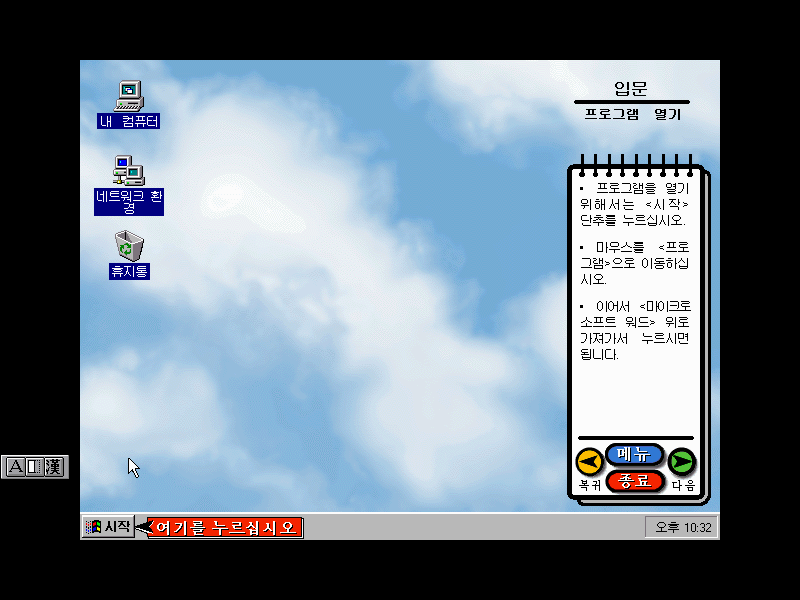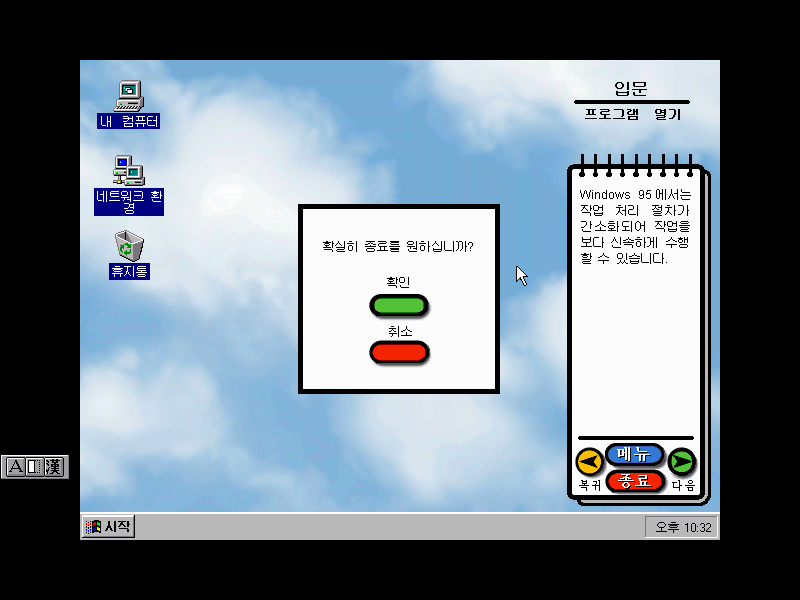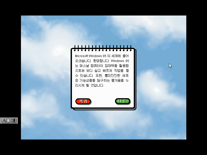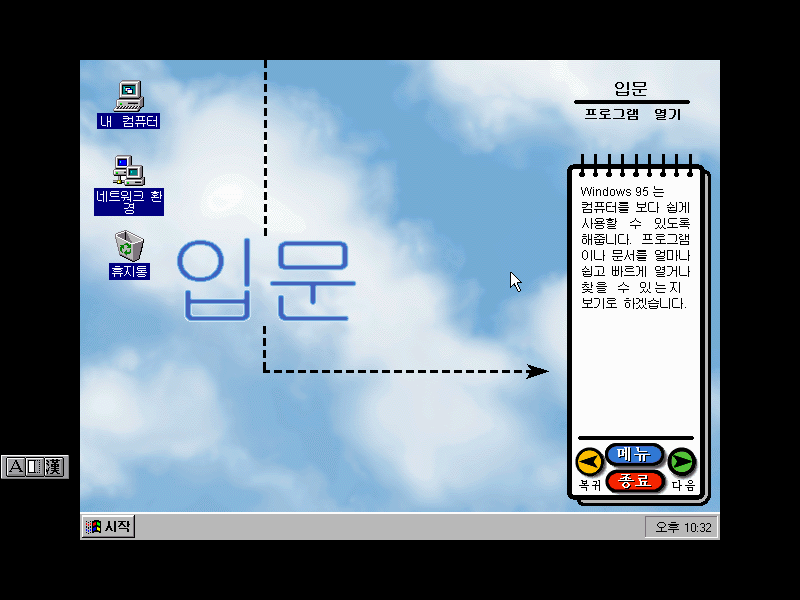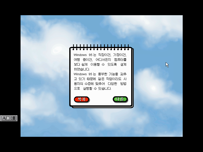 윈도우 95의 세계에 오신 것을 환영합니다. 이제 PC를 보다 쉽고 빠르게 작업할 수 있다는군요.