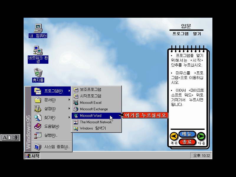 윈도우 3.1의 프로그램 그룹과 달리 윈도우 95는 간편하게 시작 메뉴를 열어 프로그램을 실행할 수 있습니다.